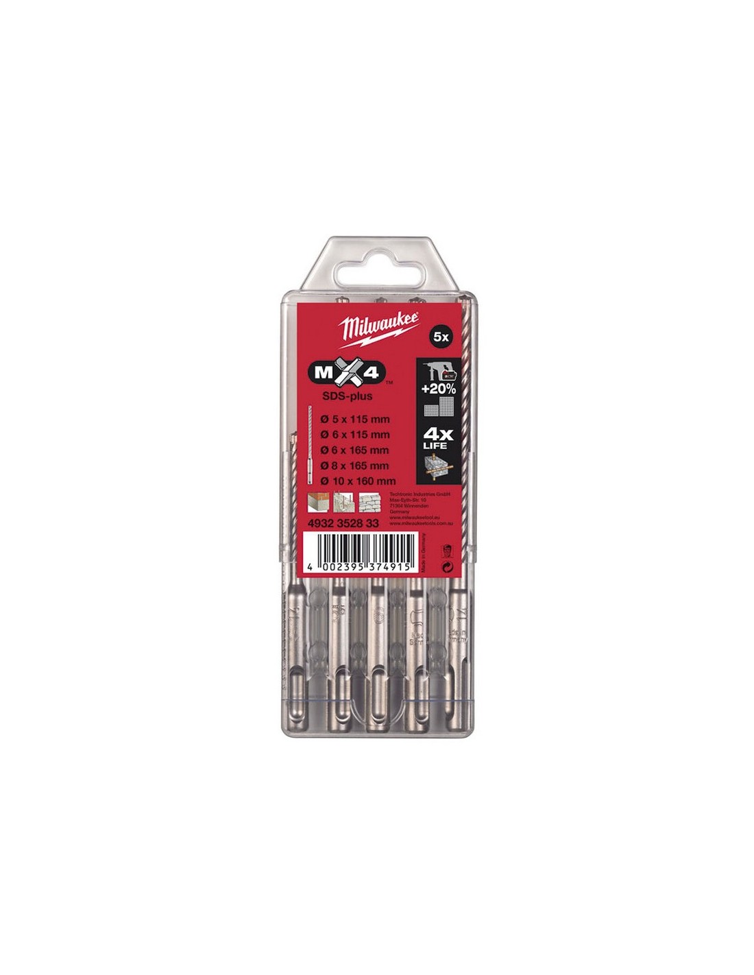 Broca piedra SDS-Plus MILWAUKEE MX4(T) - 4 cortes (MEMO) Estuche 5 brocas 5-6x115 mm, 6-8x165 mm, 10x160 mm.