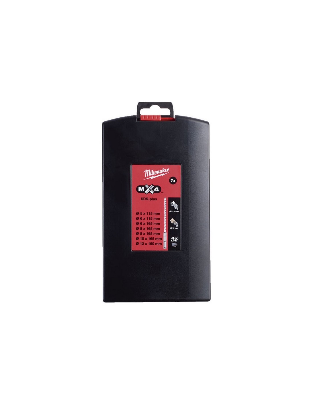 Broca piedra SDS-Plus MILWAUKEE MX4(T) - 4 cortes (MEMO) Estuche 7 brocas 5-6x115 mm, 6-8-8-10x165 mm, 12x160 mm.