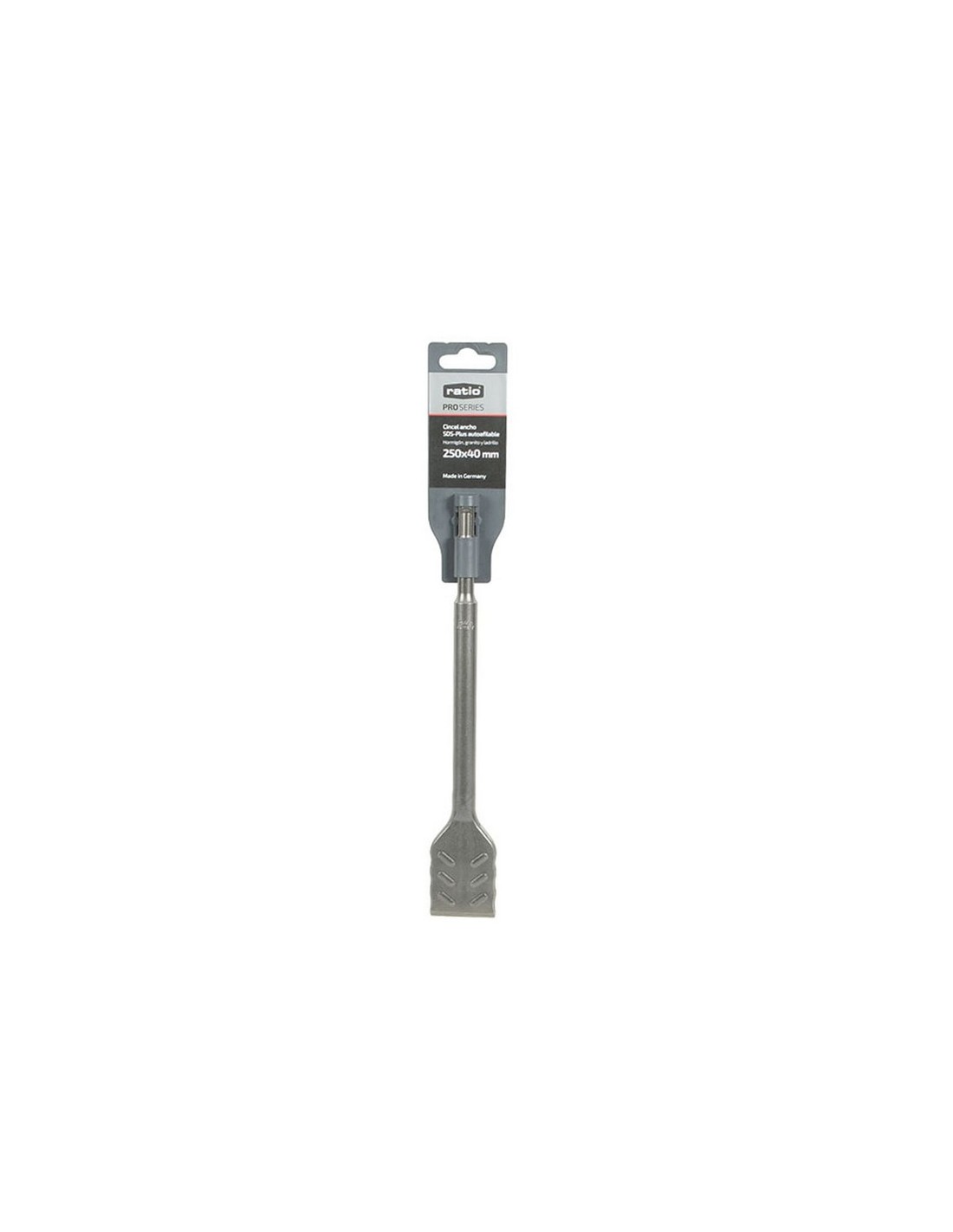 RATIOPROSERIESCincel/puntero SDS-Plus autoafilables RATIO ProSeries Para hormigón, granito y ladrillo. Mayor rendimiento y duración (hasta +150%). Máxima potencia de eliminación y protección activa de atascos del cincel. Ideal para trabajos de demolición. Diseño autoafilable para incrementar durabilidad. Cincel ancho 250x40 mm.