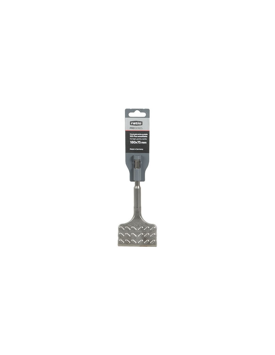 RATIOPROSERIESCincel/puntero SDS-Plus autoafilables RATIO ProSeries Para hormigón, granito y ladrillo. Mayor rendimiento y duración (hasta +150%). Máxima potencia de eliminación y protección activa de atascos del cincel. Ideal para trabajos de demolición. Diseño autoafilable para incrementar durabilidad. Cincel pala ancha acod. 250x75 mm.