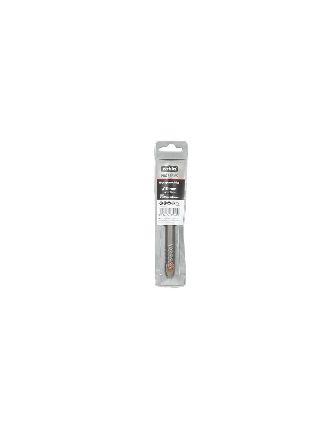 RATIOPROSERIESBroca porcelánico RATIO ProSeries Broca especial para porcelanato hasta grado "3". Plaquita afilada por los 4 lados de carburo (soldadura en cobre) con hélice con un paso muy estrecho, que acelera la extracción del polvo. Efecto torbellino para ayudar a enfriar la broca. Ideal para materiales duros y delicados y también para materiales profundos (como ladrillo macizo). Se puede utilizar sin refrigerante. ø 10x40x80 mm.
