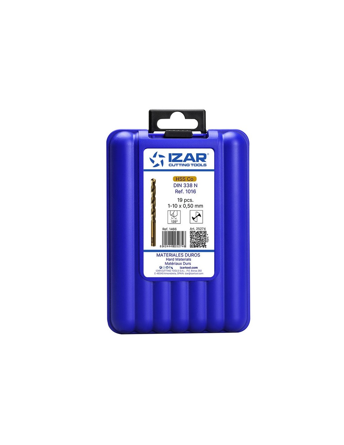 Set 19 brocas metal HSS-CO IZAR Estuche 19 brocas. Acero al cobalto (HSS-Co). DIN 338 N, geometría corte rectificada. ø 1-10x0,50 mm.