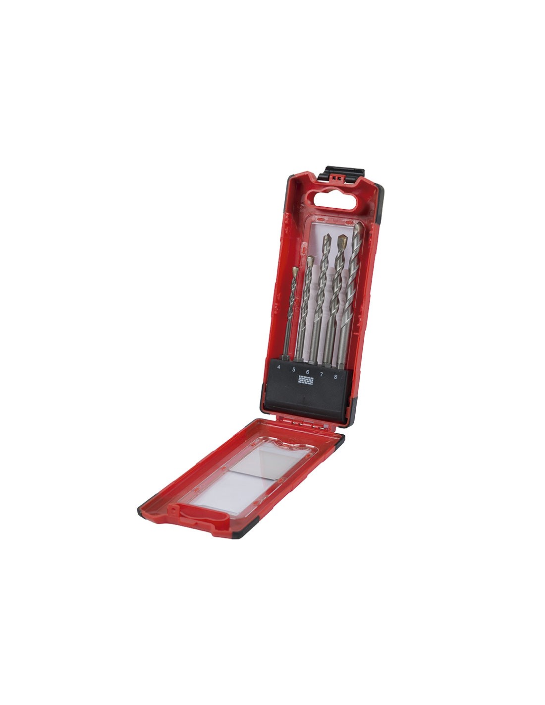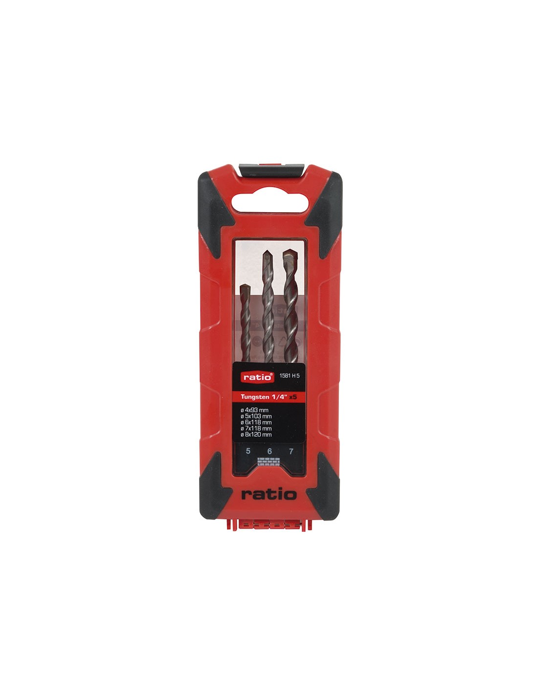 Broca pared RATIO 1581 Punta carburo tungsteno. Brocas con hexágono 1/4"(especial cordless). Estuche bimaterial 5 piezas. ø 4x93 mm. \r\nø 5x103 mm.\r\nø 6x118 mm.\r\nø 7x118 mm.\r\nø 8x120 mm.