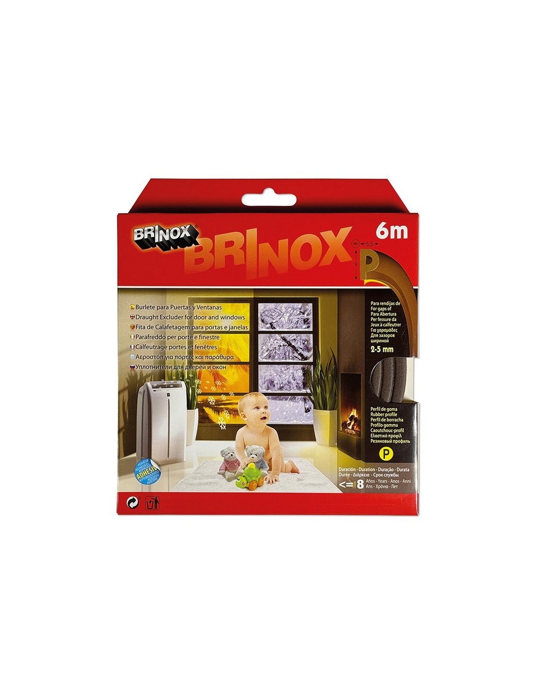 Burlete puertas y ventanas BRINOX EPDM alto nivel aislante. Adhesivo acrílico. Con cámara de aire. 6 metros. Perfil \"P\". Marrón. 5,5xh.9 mm.