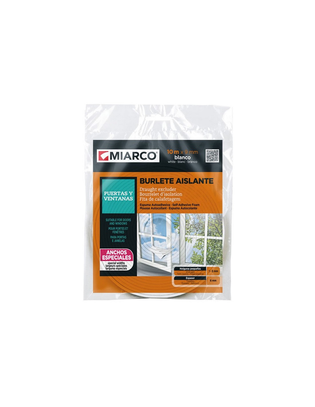 Burlete espuma MIARCO perfil rectangular Autoadhesivo. Blanco. 12 mm x 10 m.