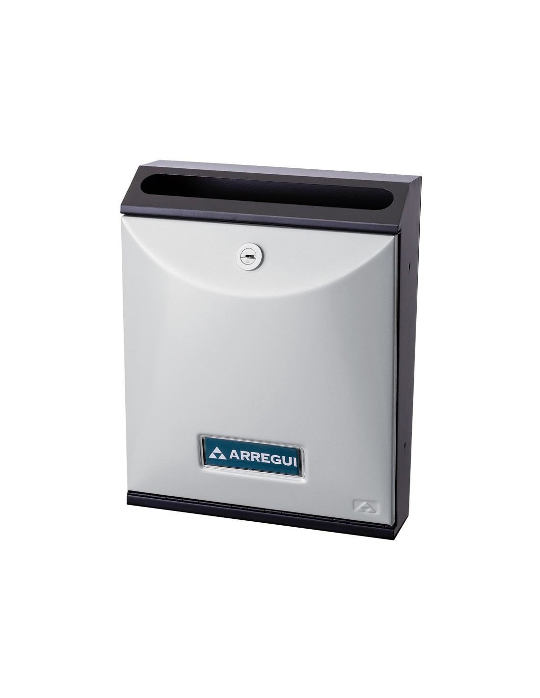 Buzón interior comunitariov ARREGUI Future. Acero pintado. Cuerpo color negro. 24,2x6,2/11xh.30,2 cm. Puerta plata perla.