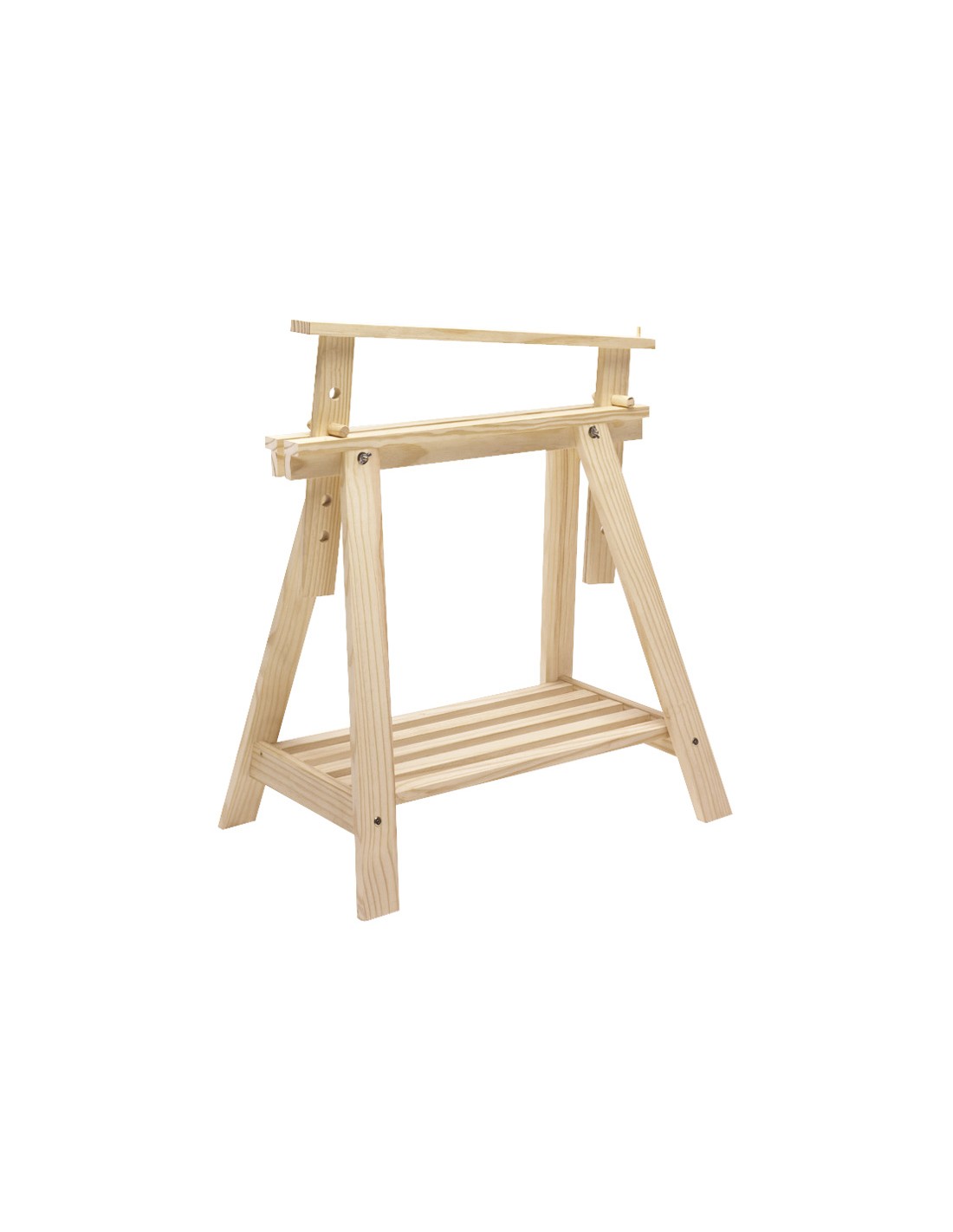 Caballete madera altura regulable. Madera de pino macizo, sin barnizar. Altura máxima 98,5 cm. 70x40xh.70/98,5 cm.