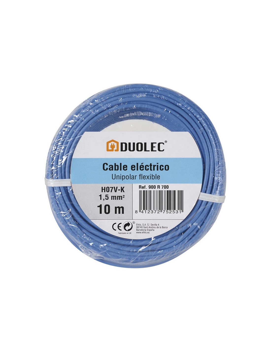 Cable eléctrico unipolar DUOLEC Flexible aislado con PVC. Tensión nominal 450/750V. UNE H07V-K. Minirollo bricolaje. 1,5 mm. Azul. 10 m.
