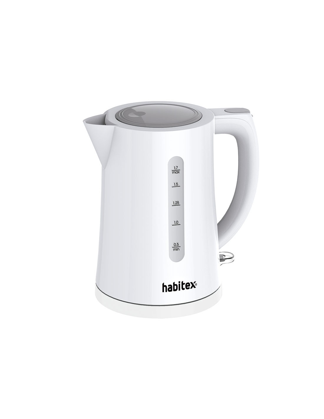 Hervidor de agua HABITEX CC5801. Cuerpo de plástico ABS blanco. Apertura automática de la tapa. Base de posición libre 360º. Indicador de nivel de agua. Recogecable. Potencia: 2.200 W.