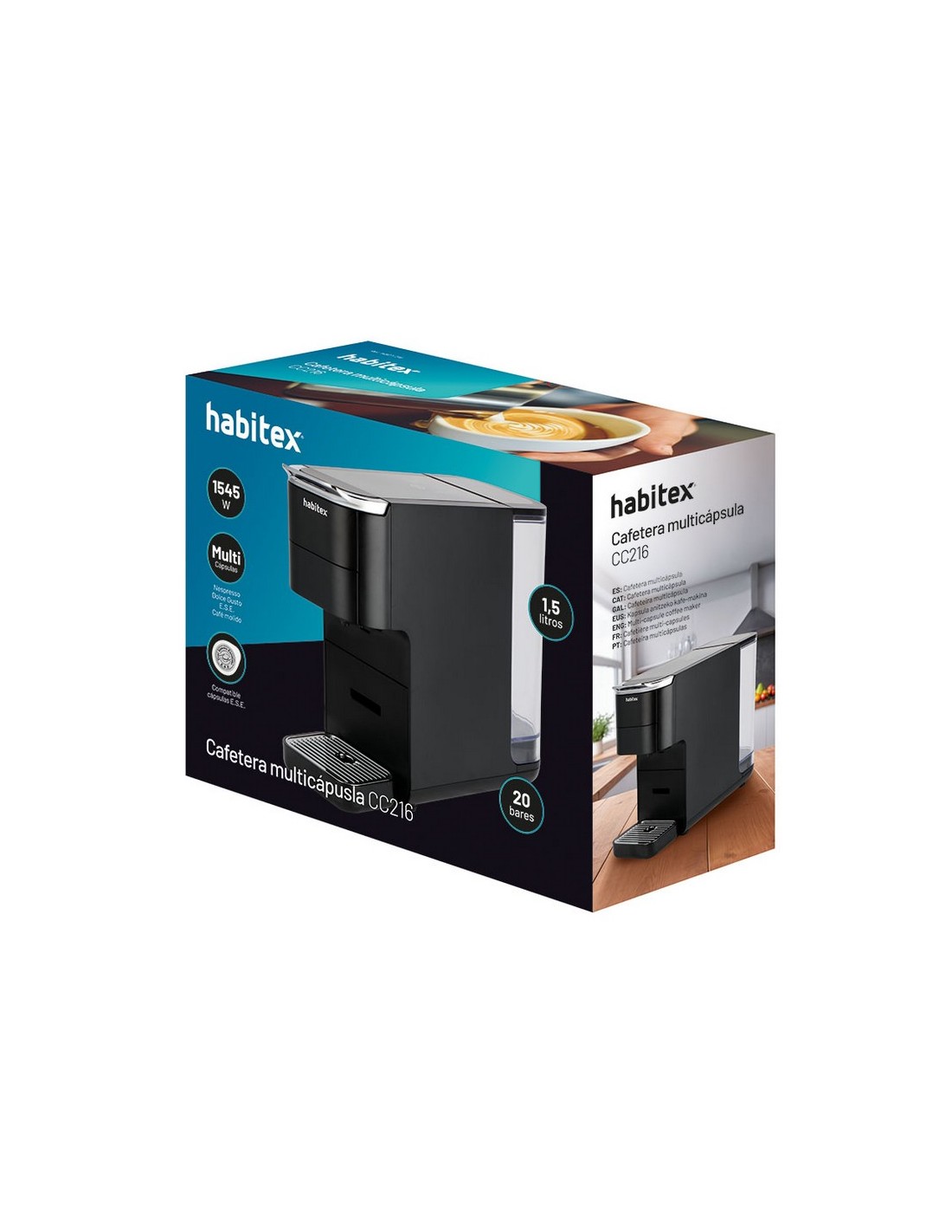 Cafetera multi-cápsula 4 en 1 HABITEX CC216 Cafetera multicápsula de 1.400-1.525 W con bomba de 20 bares y tanque de agua de 1.5l. Calentamiento rápido y control de temperatura ajustable. Compatible con cápsulas Nespresso, Dolce Gusto, ESE y café molido. Potencia: 1.400-1.525 W.