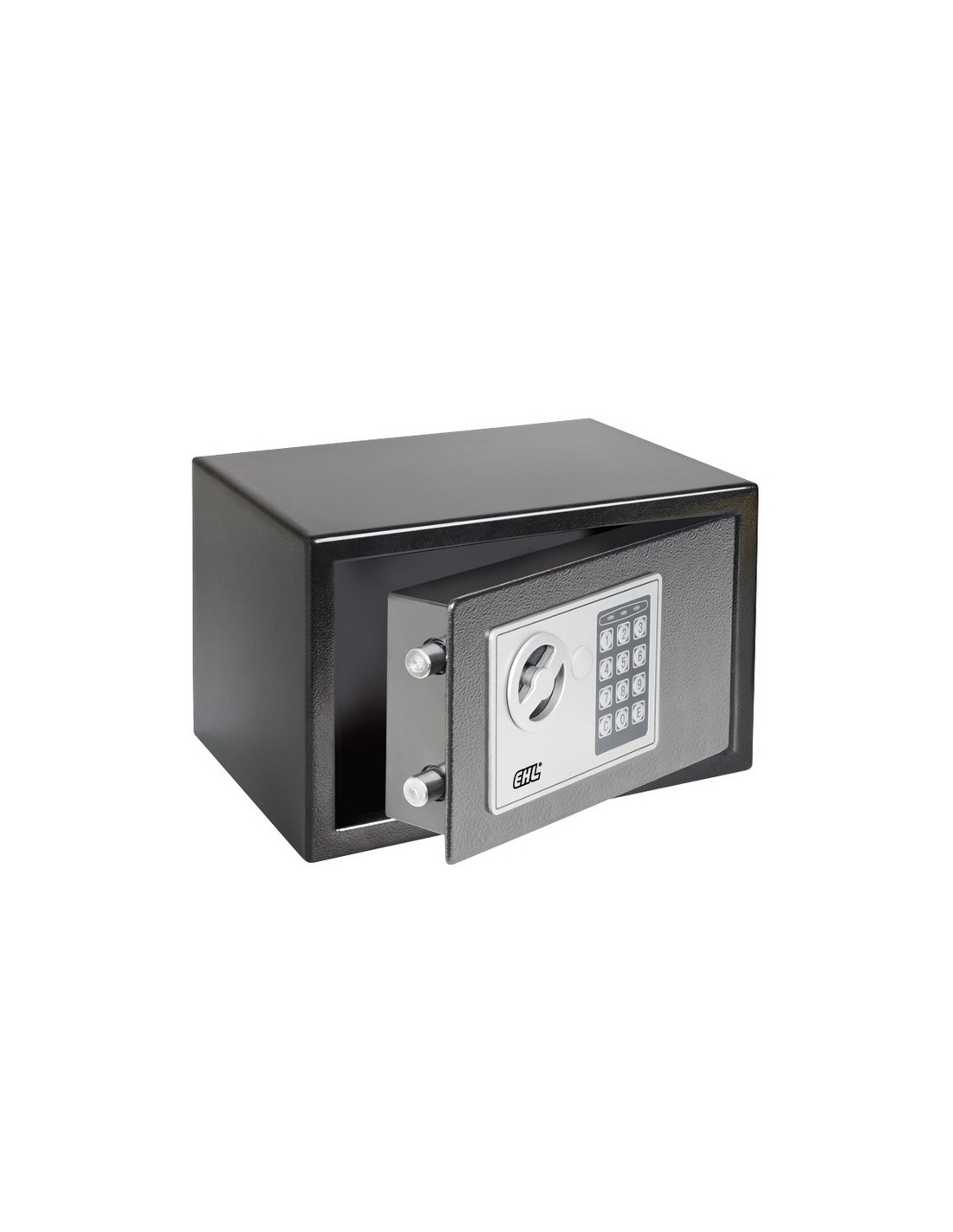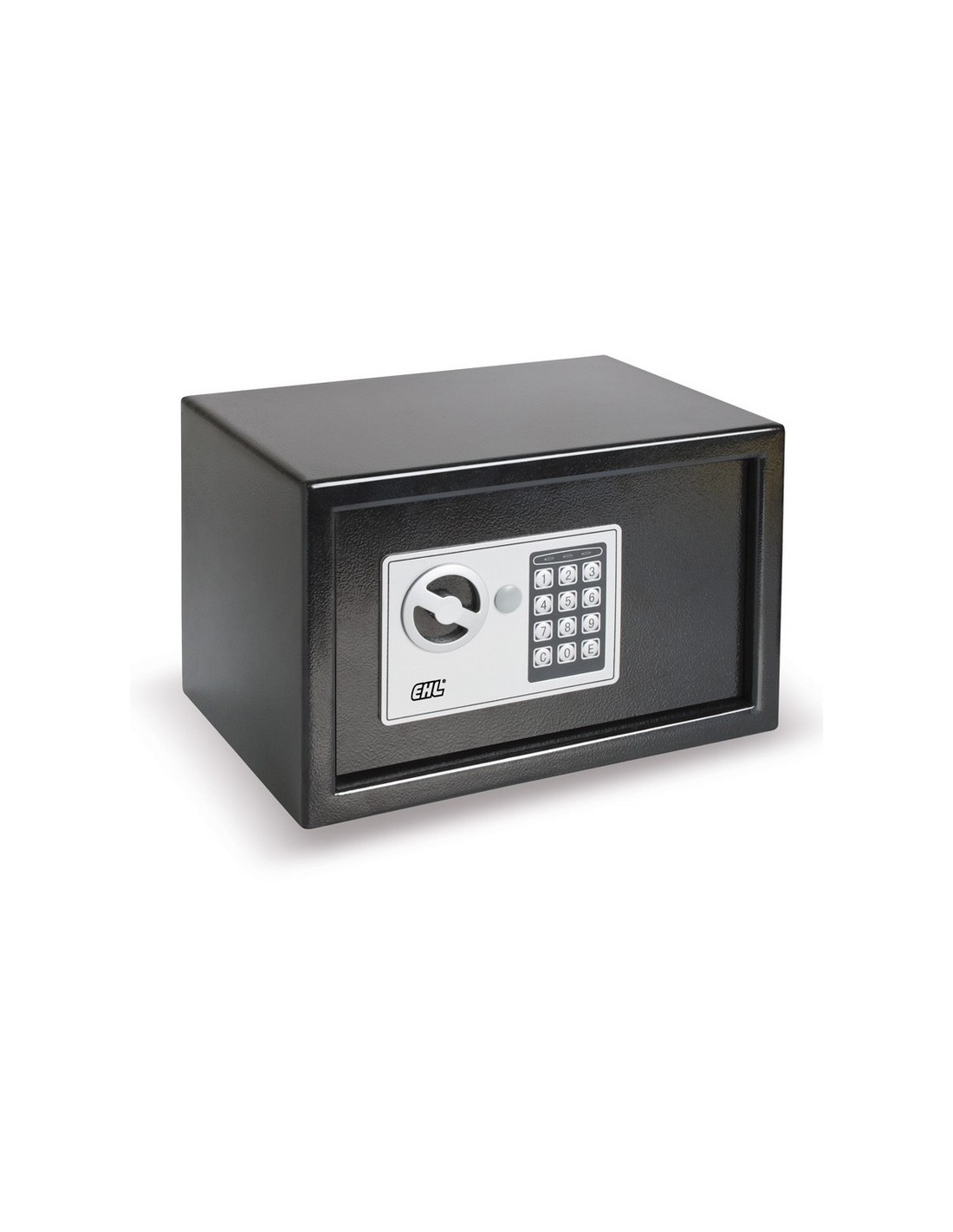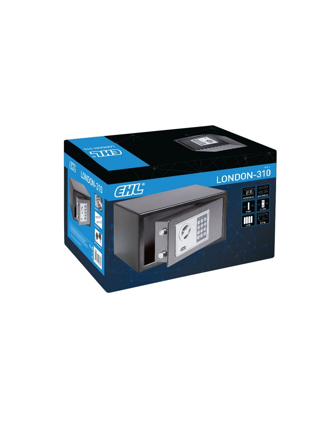 Caja seguridad sobreponer electrónica EHL London. Frente y puerta de acero. Apertura código y pomo. 2 llaves de emergencia. Kit de fijación. Para hacer copias llave en bruto JMA CHI-1T. London 310: