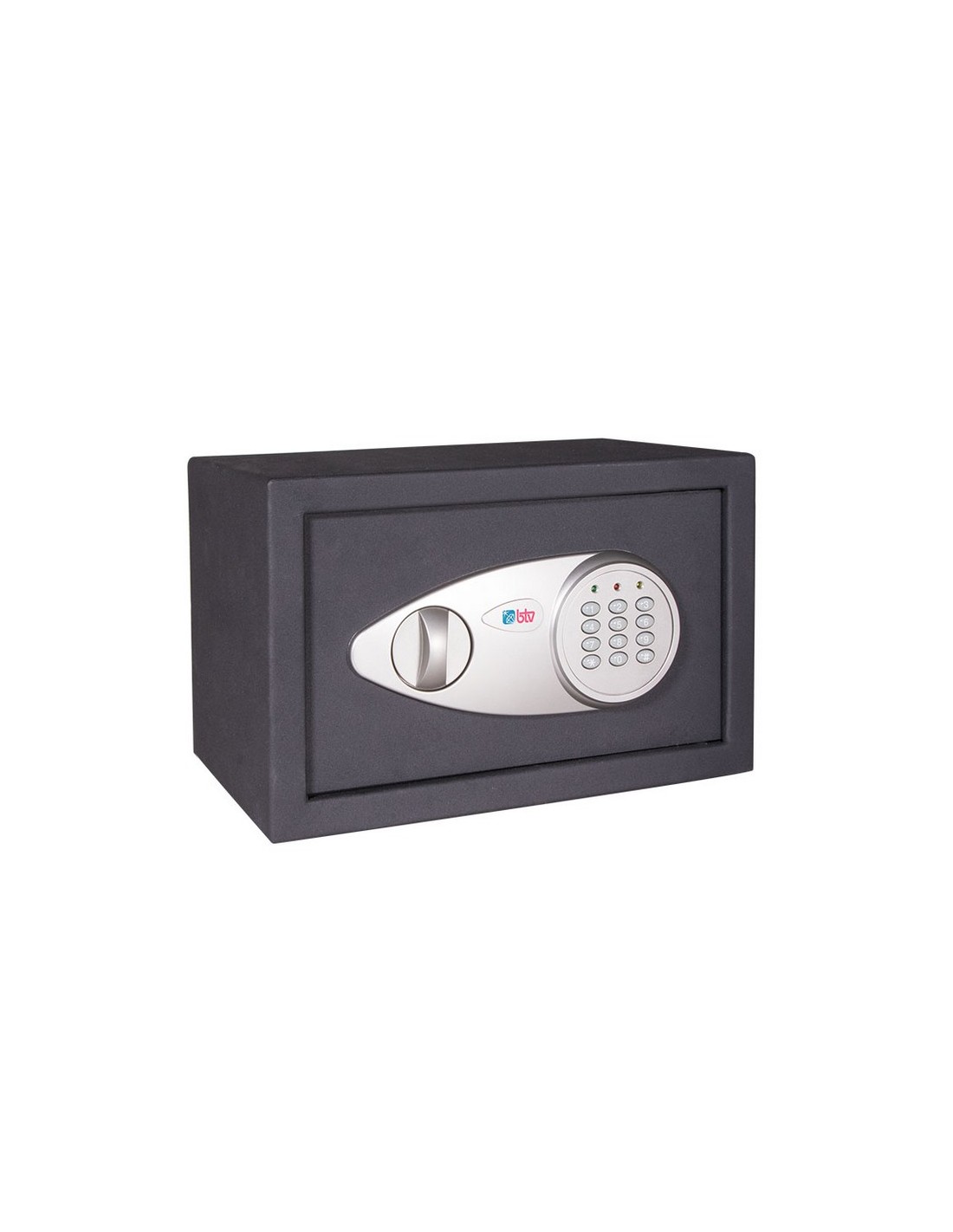 Caja seguridad sobreponer electrónica BTV Alpha Espesor puerta de 4 mm. Cuerpo 1,5 mm. 2 bulones ø 20 mm. Cerradura de pomo + teclado: 2 a 8 dígitos. Cerradura de emergencia. Aviso de pilas bajas. 4 pilas AA incluidas. Color negro. 35x25xh.25 cm.