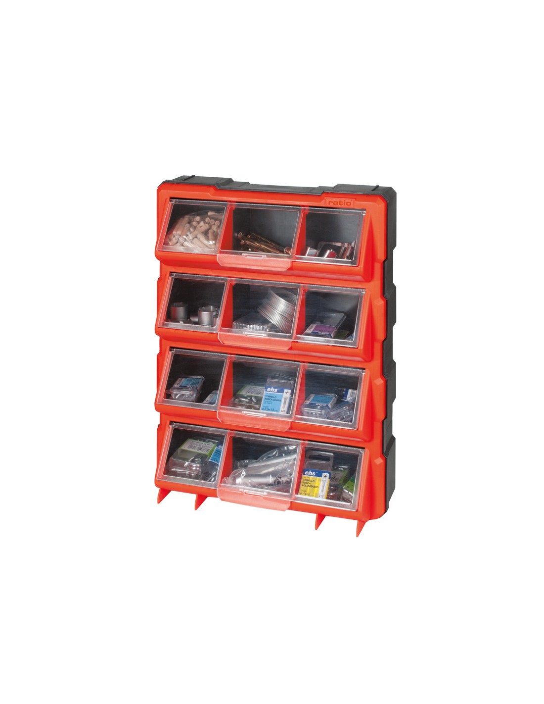 Sistema de clasificación RATIO Setbox. Estructura poliestireno de alto impacto. Cajones de polipropileno transparente. Módulos apilables entre si. Sistema de fijación a pared. SetBox 6687-12 compartimentos.\r\n36x12xh.46 cm.\r\n12 compartimentos con tapa de policarbonato transparente. \r\nAsa integrada de transporte. \r\nTapas con sistema de cierre que evita derrame.