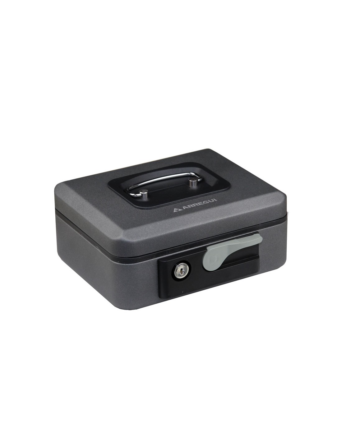Caja de caudales ARREGUI serie Pop up Acero pintado. Bandeja portamonedas interior. Apertura mediante llave de serreta y pulsador. Gris grafito. 152x115xh.80 mm.