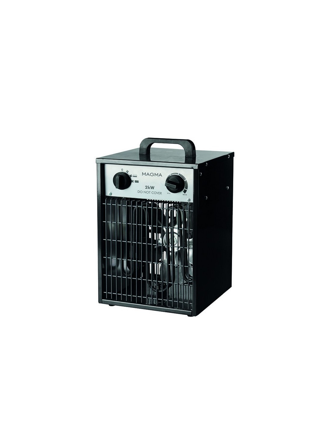 Aerotérmico eléctrico Fácula Magma Aerotermo eléctrico industrial. Cuerpo de acero inoxidable. Función ventilación-calefacción. Termostato ajustable. Pintura resistente a altas temperaturas. Asa para transporte. 2000 W. 2 potencias: 1/2 kW. Caudal aire 20 m2. 32x23x20 cm.