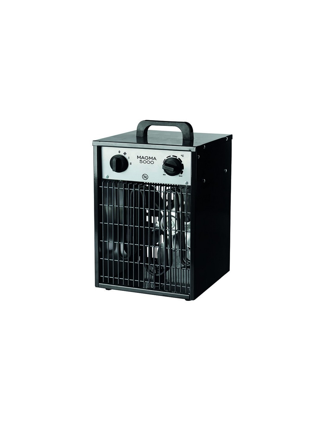 Aerotérmico eléctrico Fácula Magma Aerotermo eléctrico industrial. Cuerpo de acero inoxidable. Función ventilación-calefacción. Termostato ajustable. Pintura resistente a altas temperaturas. Asa para transporte. 5000 W. 2 potencias: 2,5/5 kW. Caudal aire 48 m2. 40x28xh.26 cm.