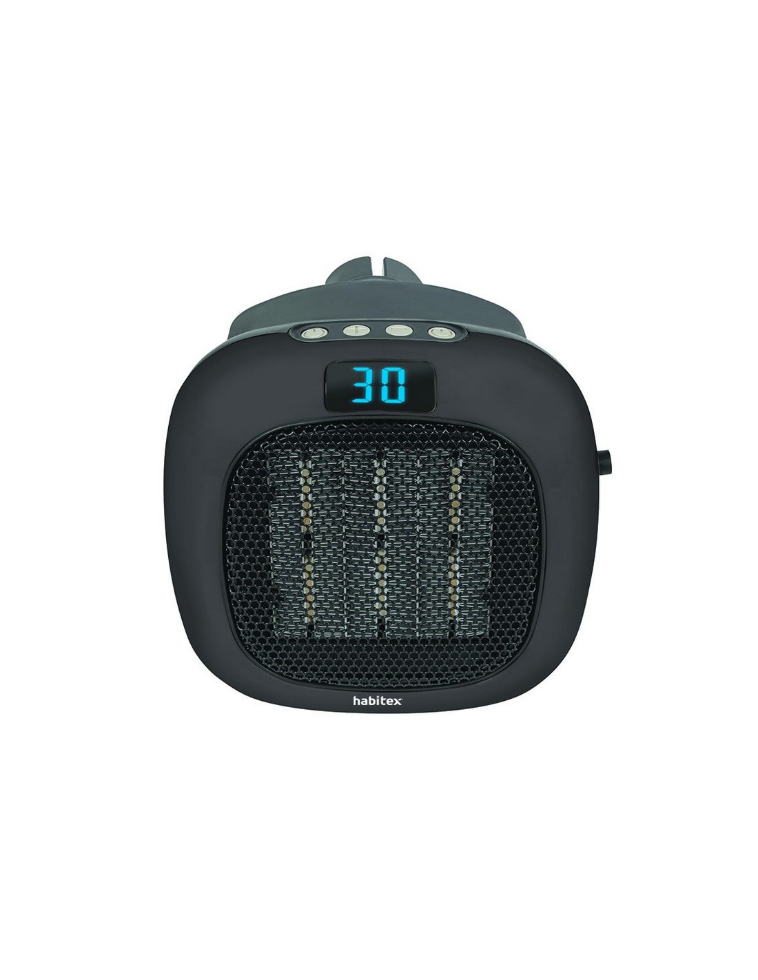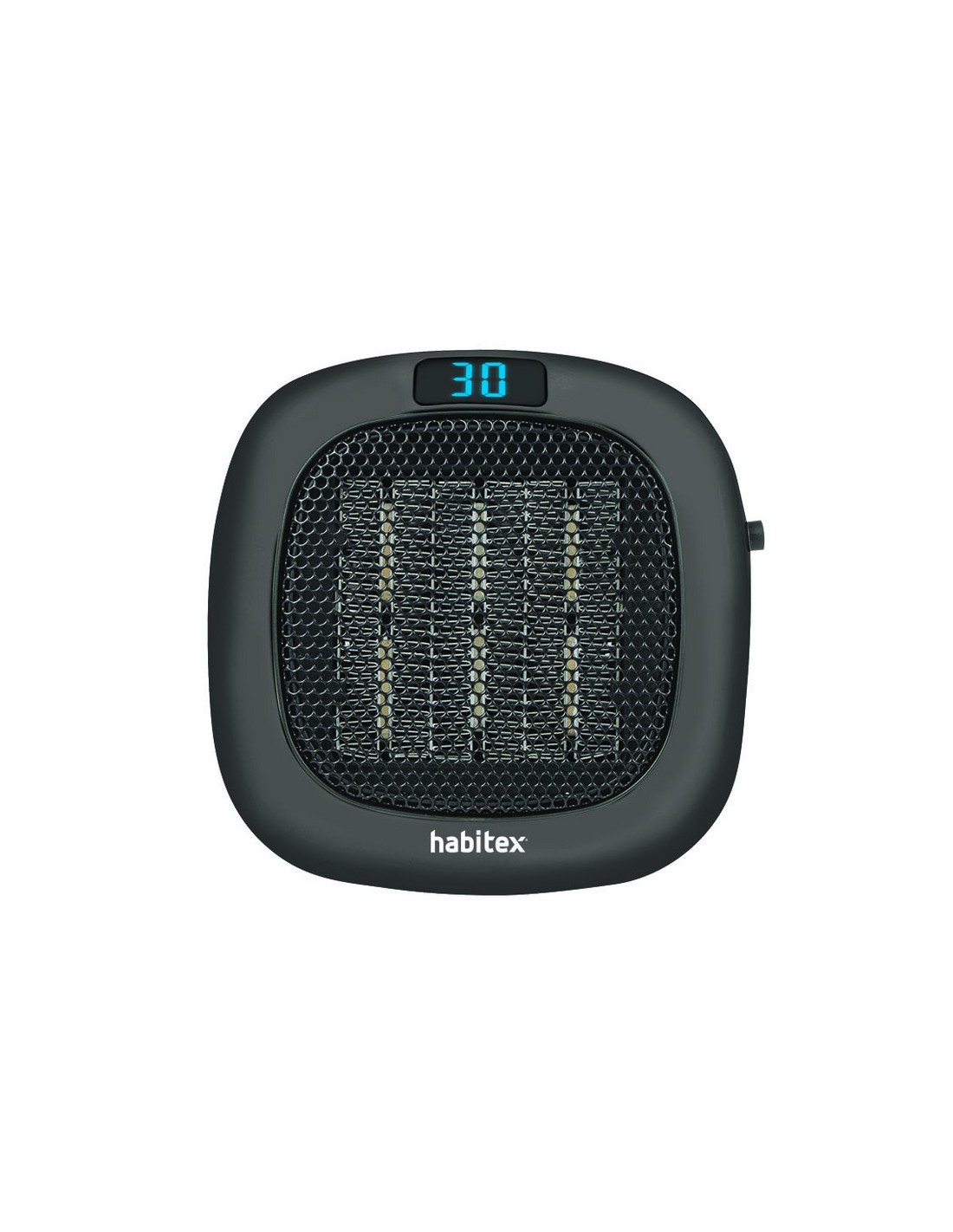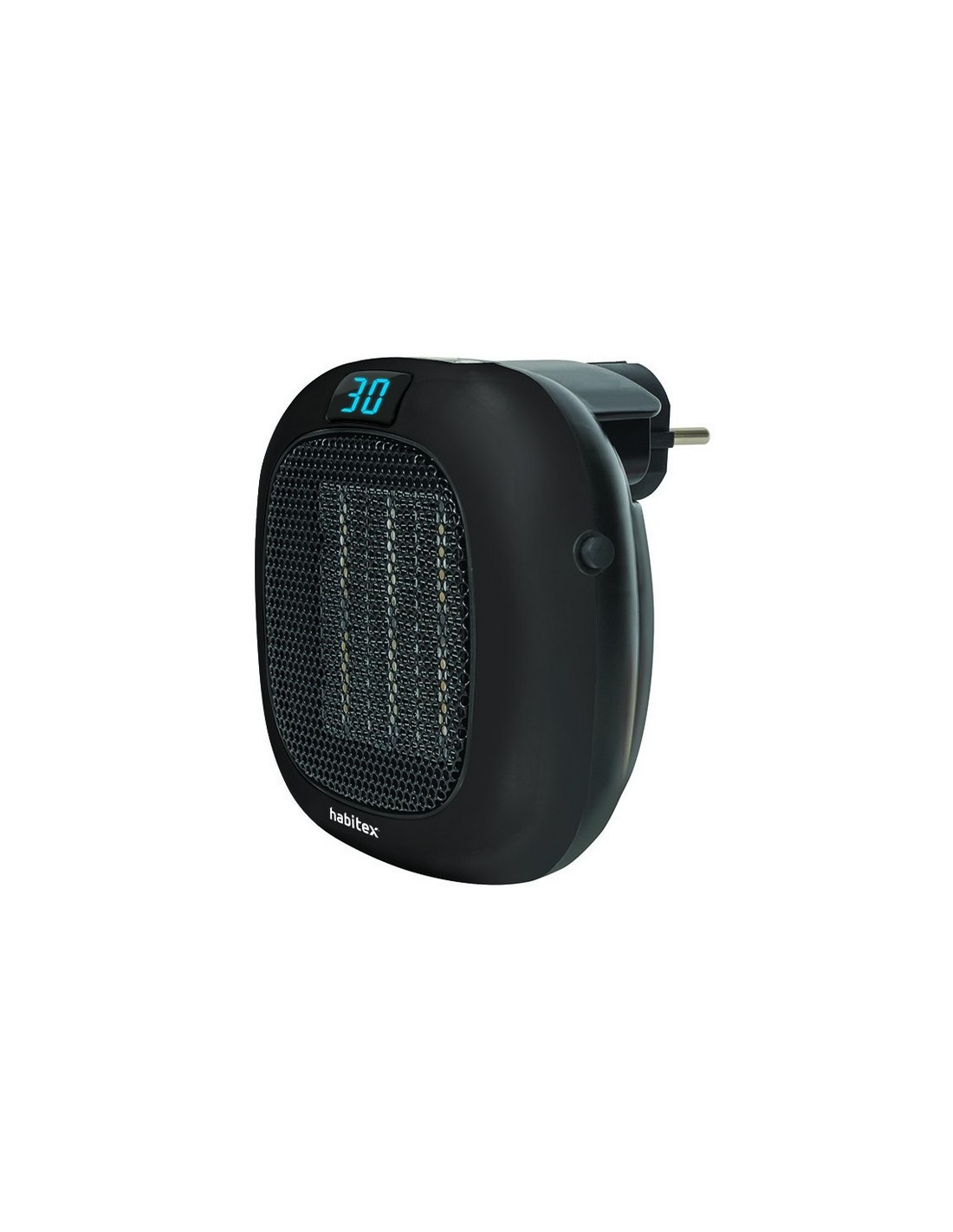 Minicalefactor cerámico HABITEX HQ434/B Termostato digital regulable entre 15 y 30°. Display led. Con conexión directa al enchufe, el cual es giratorio 90° para facilitar su instalación a la toma de corriente. Protección sobrecalentamiento. Negro.