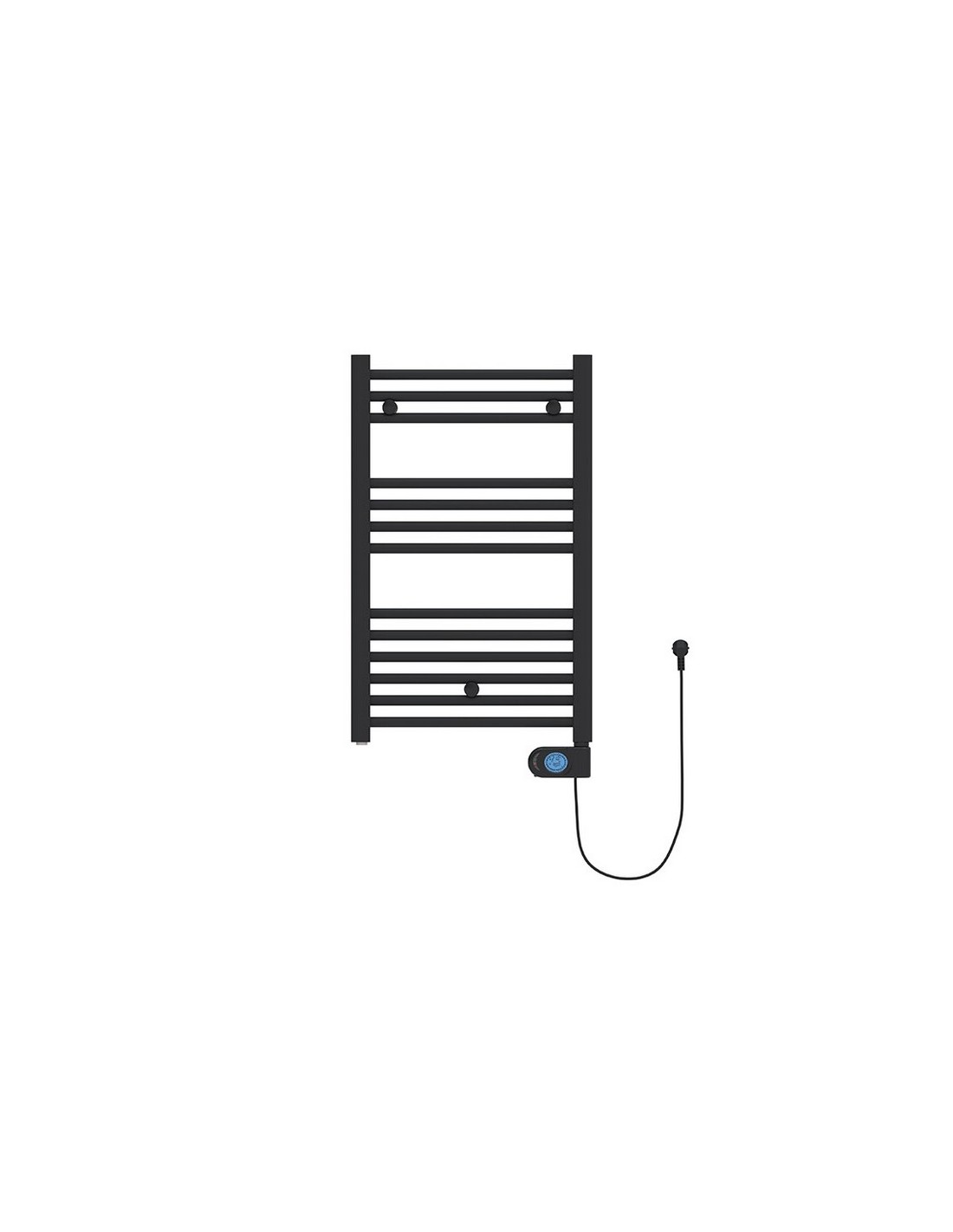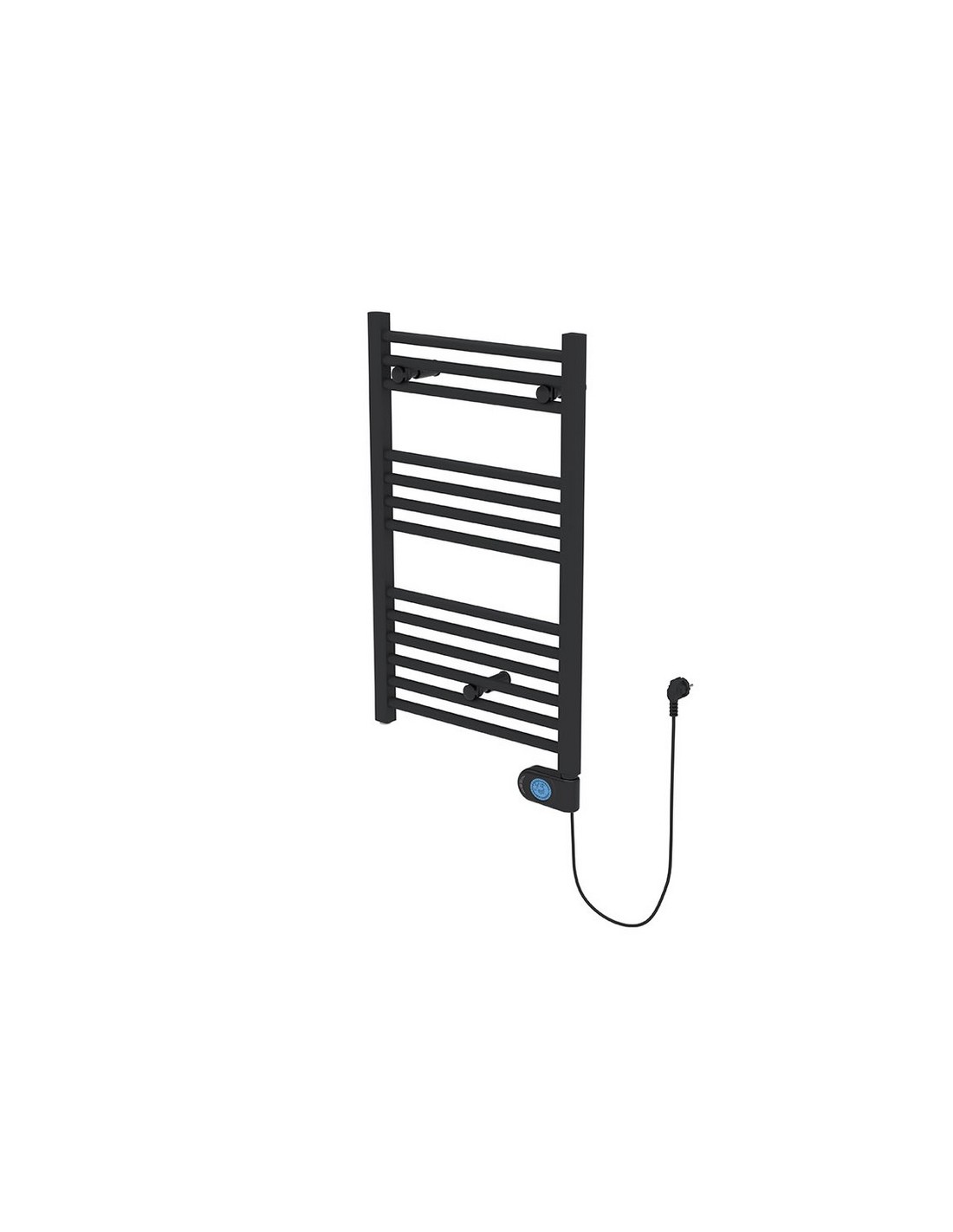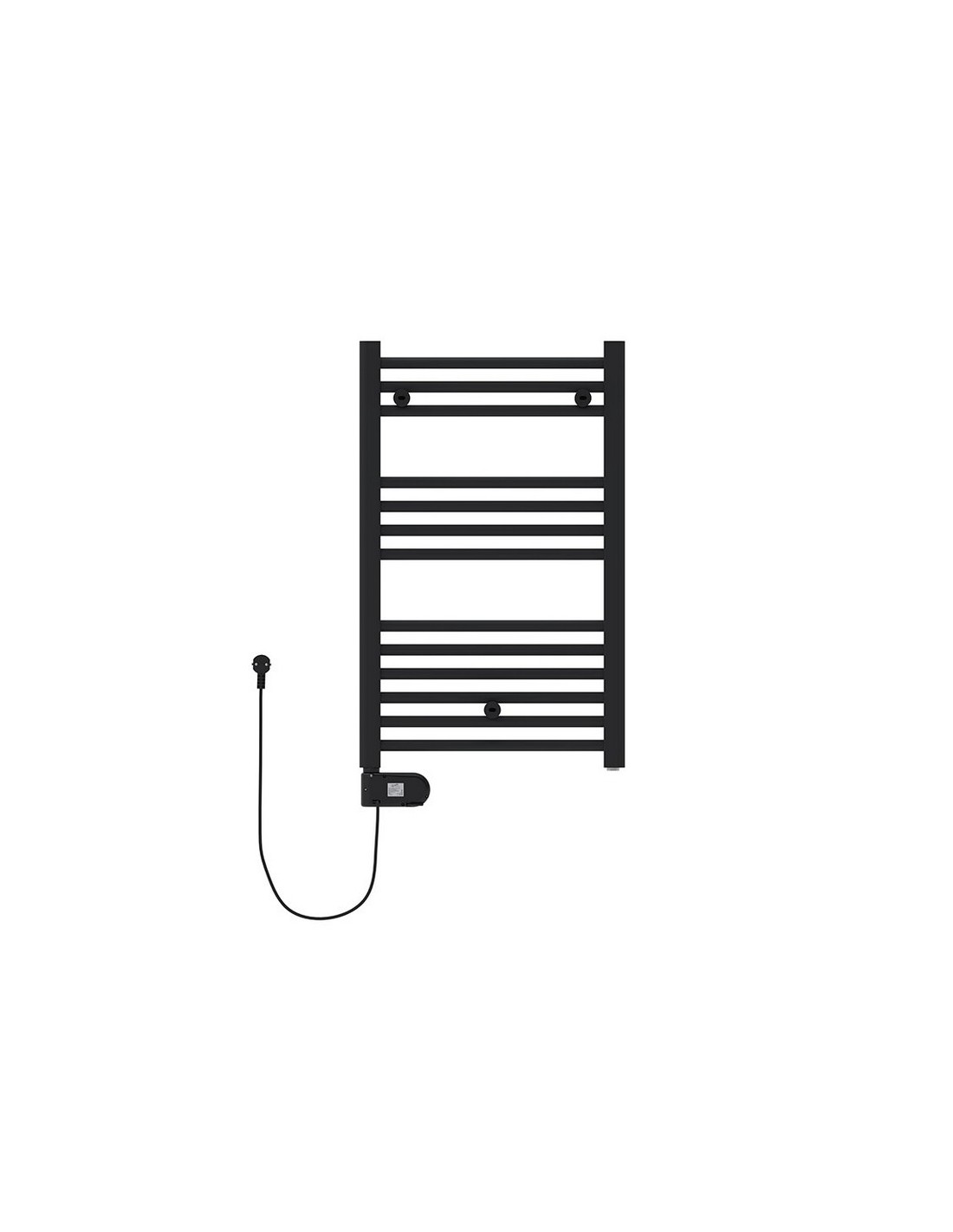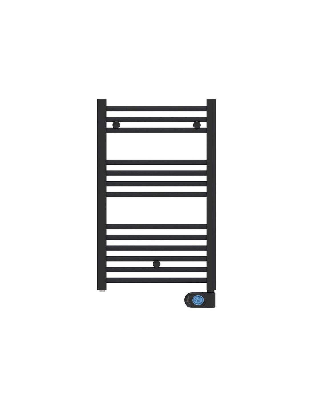 Toallero programable con fluido FACULA Eco IP44. Máximo rendimiento y seguridad. Función ON/OFF. Boost 2h. Función ventanas abiertas. Programación diaria/semanal. Enchufe Schuko. Modo Confort. Cable 1.2 m. Modo Noche. Modo Antihielo. Modo Stand-by. 400 W. 50x9xh.87,6 cm. Negro.