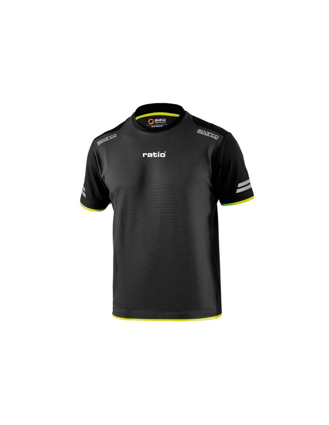 Camiseta RATIO by Sparco Tech Amarillo Composición: 50% algodón - 50% poliéster con efecto piqué / 170 g/m². Rayas de alta. visibilidad en mangas reflectantes. Hombros reforzados. Inserciones en contraste. Talla L.