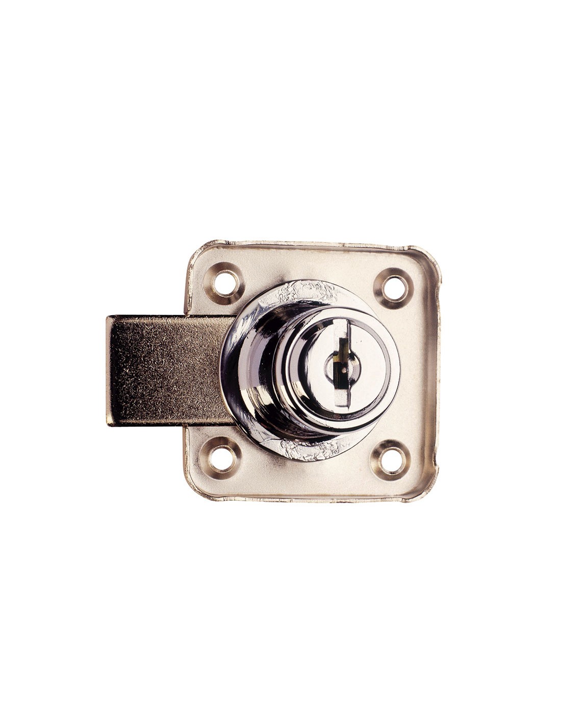 Cerradura de sobreponer para armario AGA 362. Cilindro zamac cromado. Escudo embellecedor y 4 tirafondos ø 3x20 mm. 2 llaves. 20 mm. Llaves iguales.