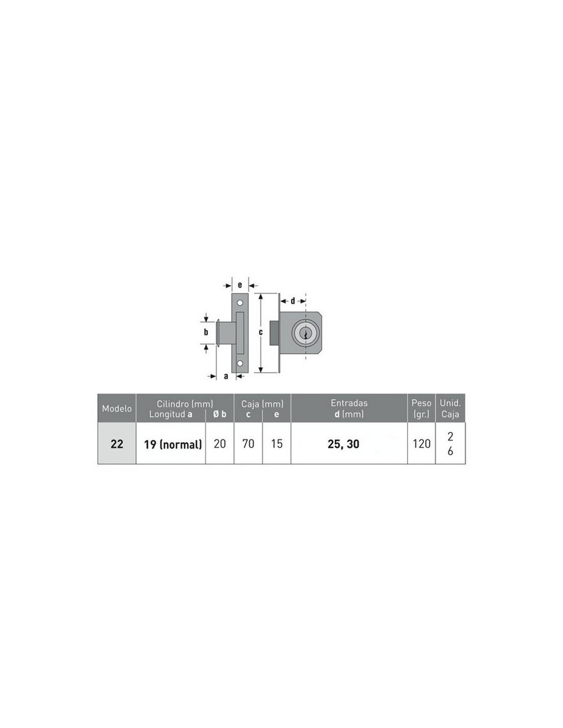 Cerradura embutir madera URKO 22. Cilindro latón. Llaves estriadas. Reversible. Entrada 25 mm. Cilindro 19 mm.