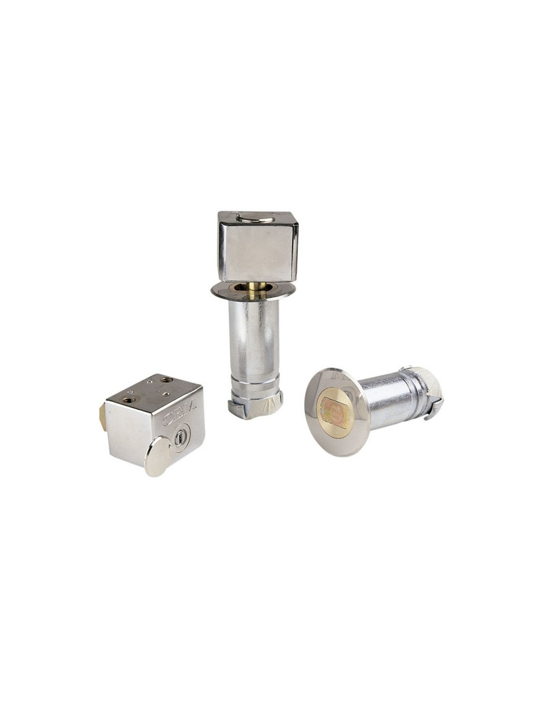 Cerradura puerta enrollable KEYMAT. Cilindro de seguridad con 3 llaves de puntos. Distancia entre tornillos 42 mm. Incluye cabezal apertura superior y cerradero cilíndrico empotrable. 1 unid.
