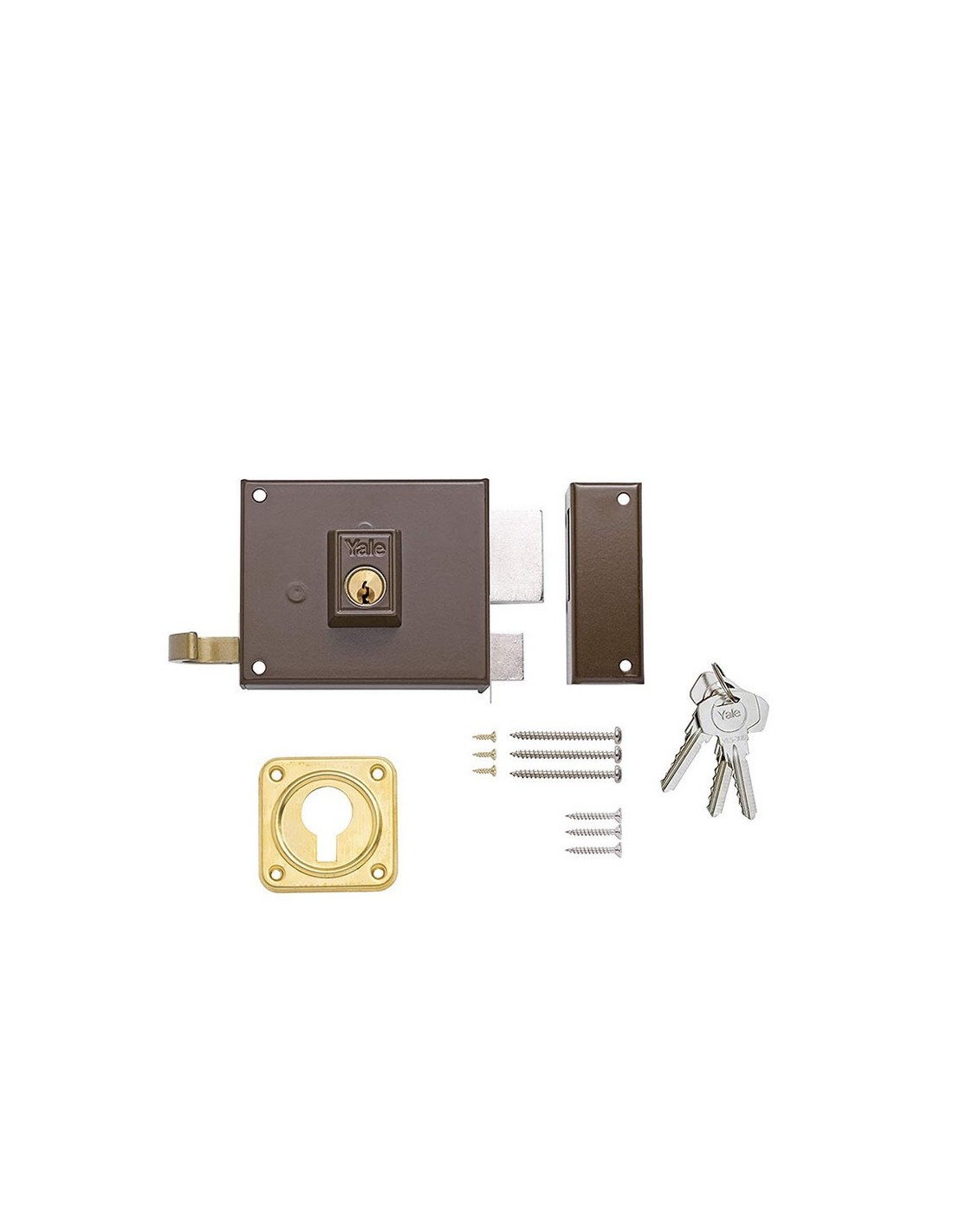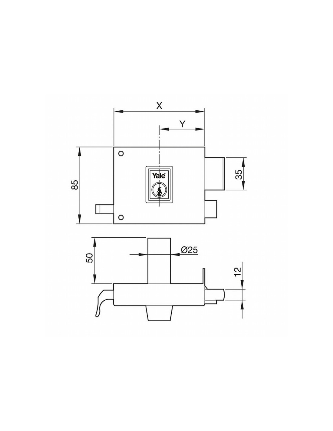 Cerradura sobreponer YALE 125 Golpe y llave. Cilindro exterior redondo, interior pera. Dimensiones: Y48-X80 ; Y50-X100 ; Y60-X120 ; Y70-X140. Pintada. Derecha. 120 mm.
