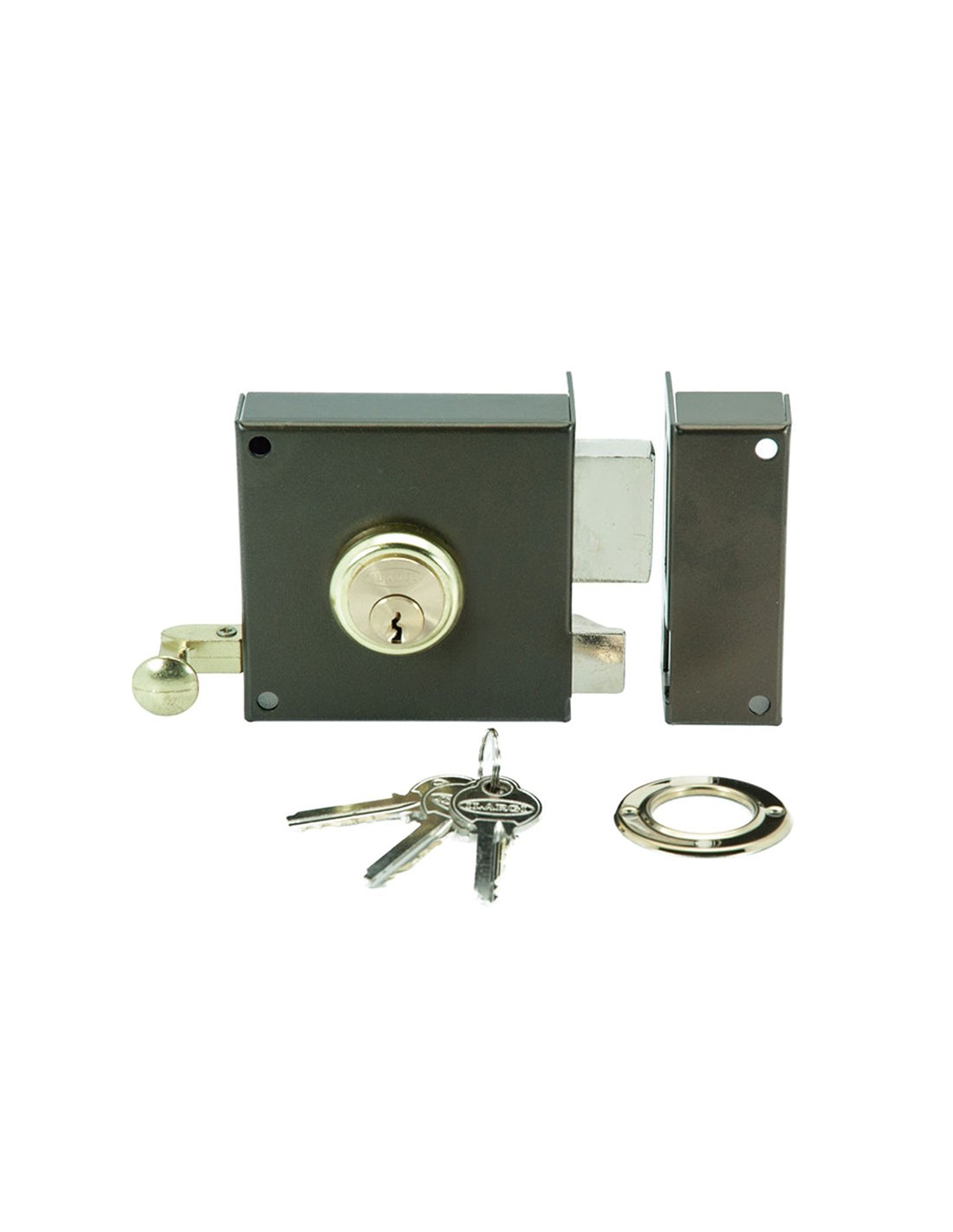 Cerradura sobreponer ILARGI 125A Cilindro de serreta y tirador accionado con llave por ambos lados. Picaporte accionaado con llave y tirador por el interior. Incluye 3 llaves. Cilindro redondo. Entrada 60 mm.
