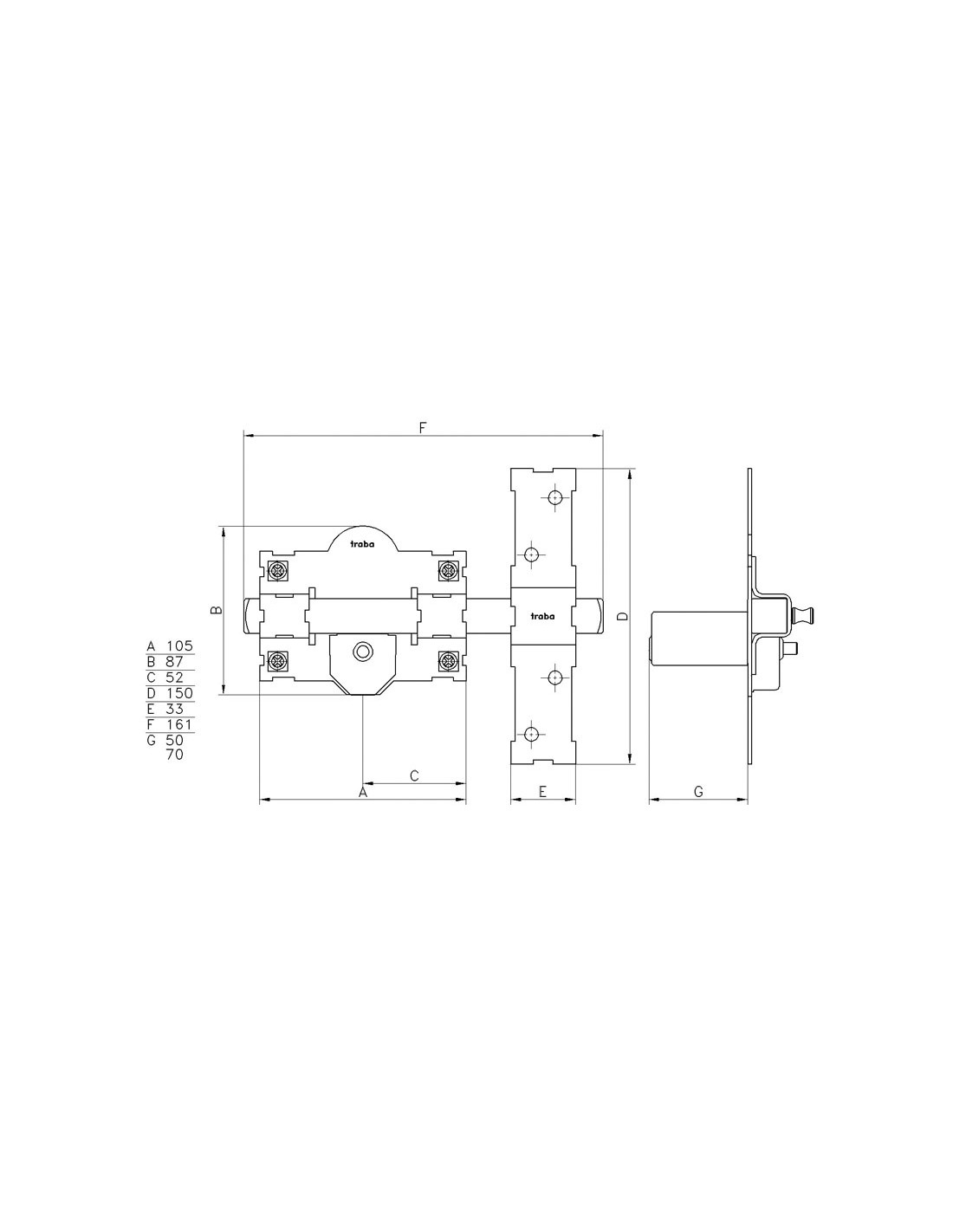 Cerrojo TRABA 101R Llave exterior y botón interior. Placa acero 2 mm. Cerradero acero 3 mm. Cilindro redondo. 3 llaves dentadas. Pintado. Cilindro 50 mm.