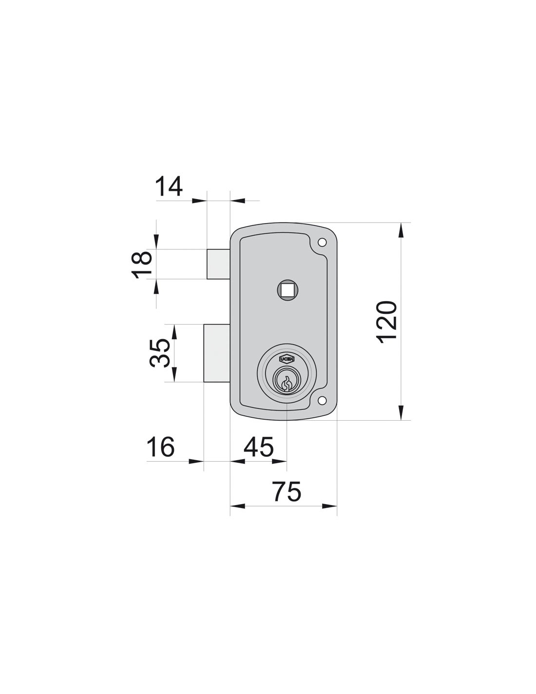 Cerradura sobreponer UCEM 4056B Cilindro mod. 4000F. Golpe accionado por manilla interior y llave exterior. Cierre mediante llave a ambos lados. Izquierda. Entrada 35 mm.
