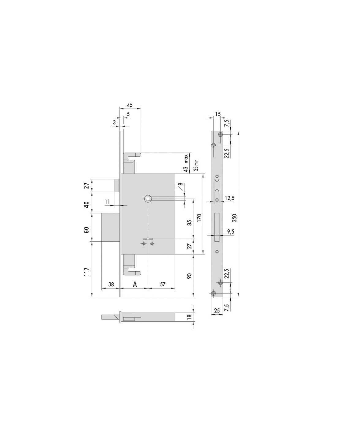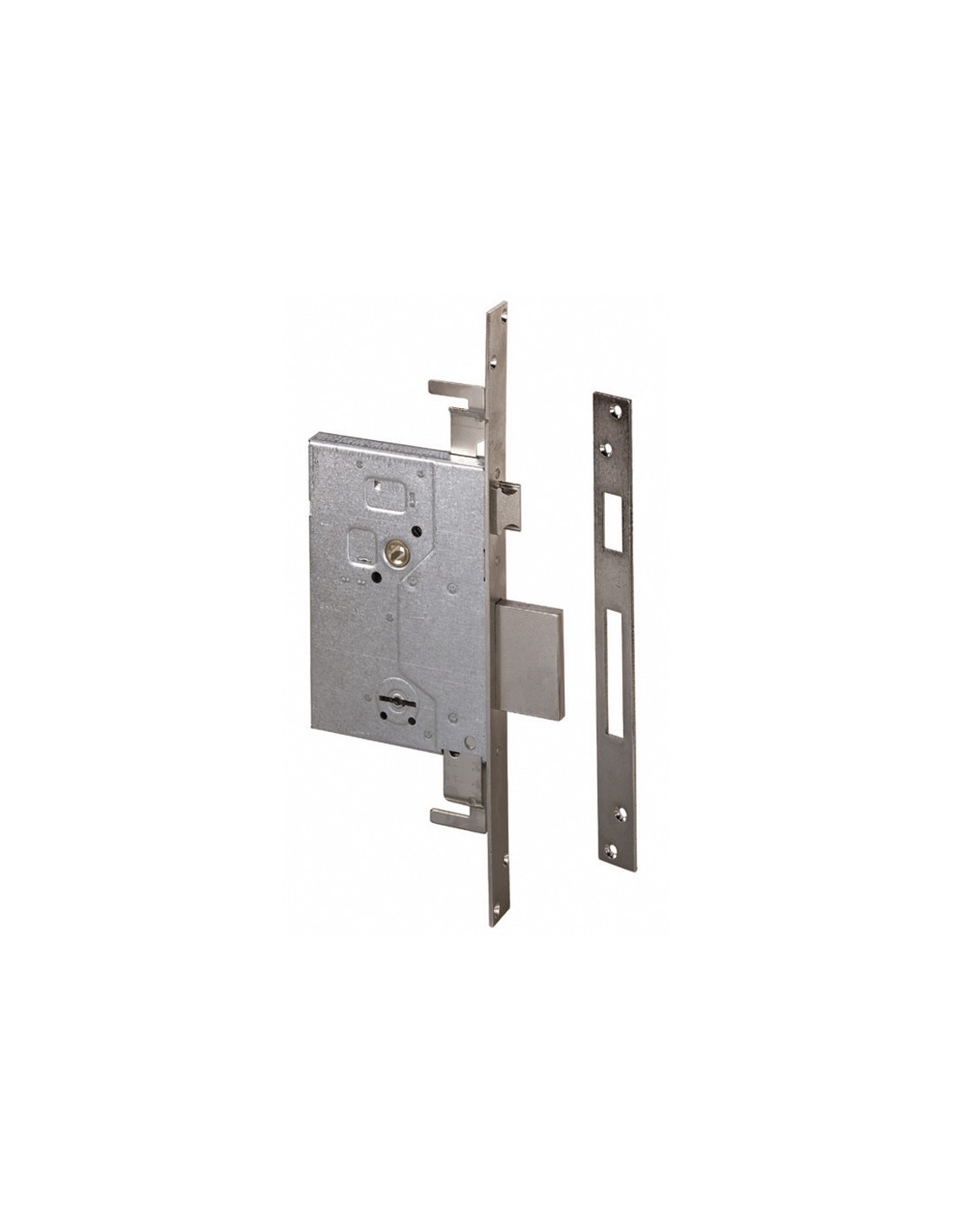 Cerradura embutir de borjas CISA Cuatro vueltas con palanca. Frente y cerradero de acero satinado niquelado. Caja y palanca de acero. Frente de acero inoxidable. Picaporte y palanca niquelados. Picaporte, palanca y cierre superior. Entrada 60 mm.