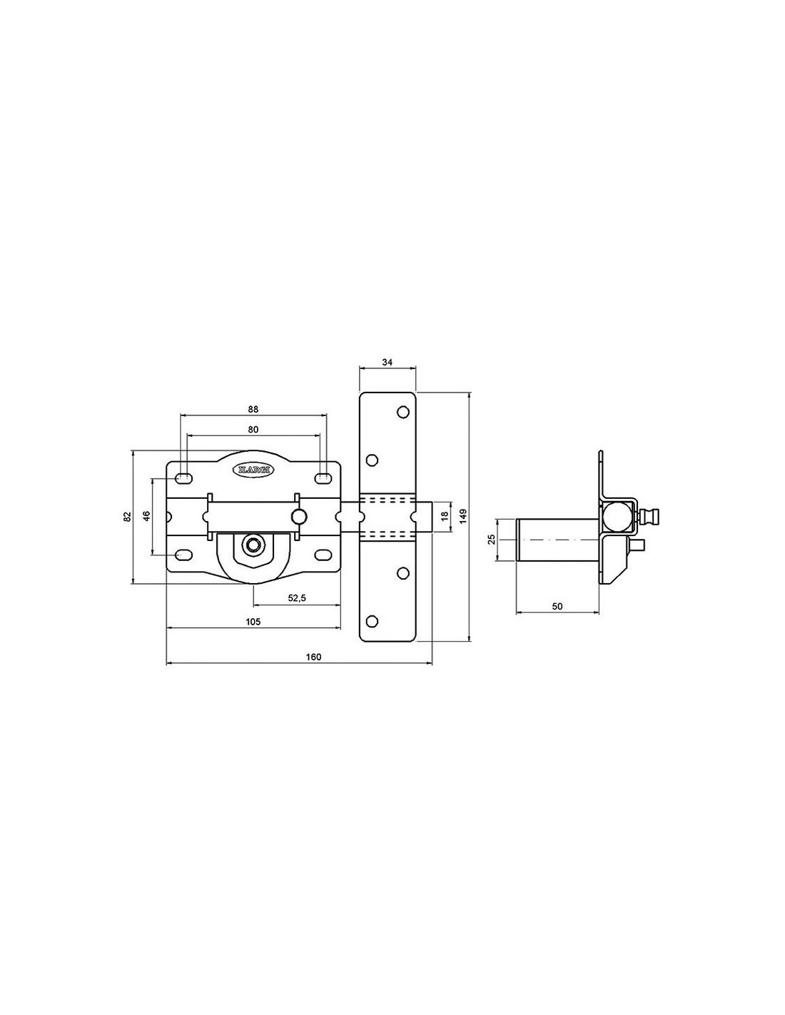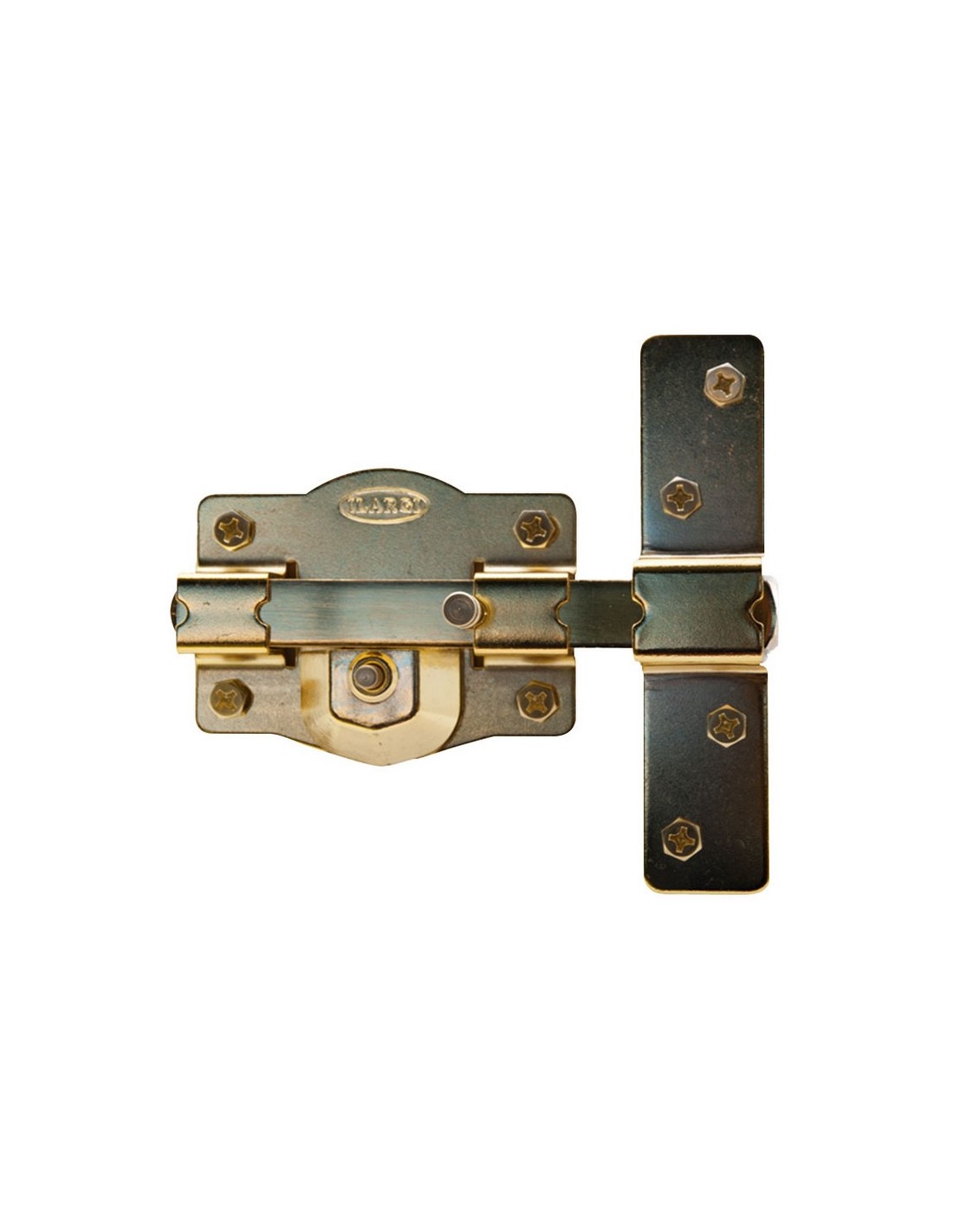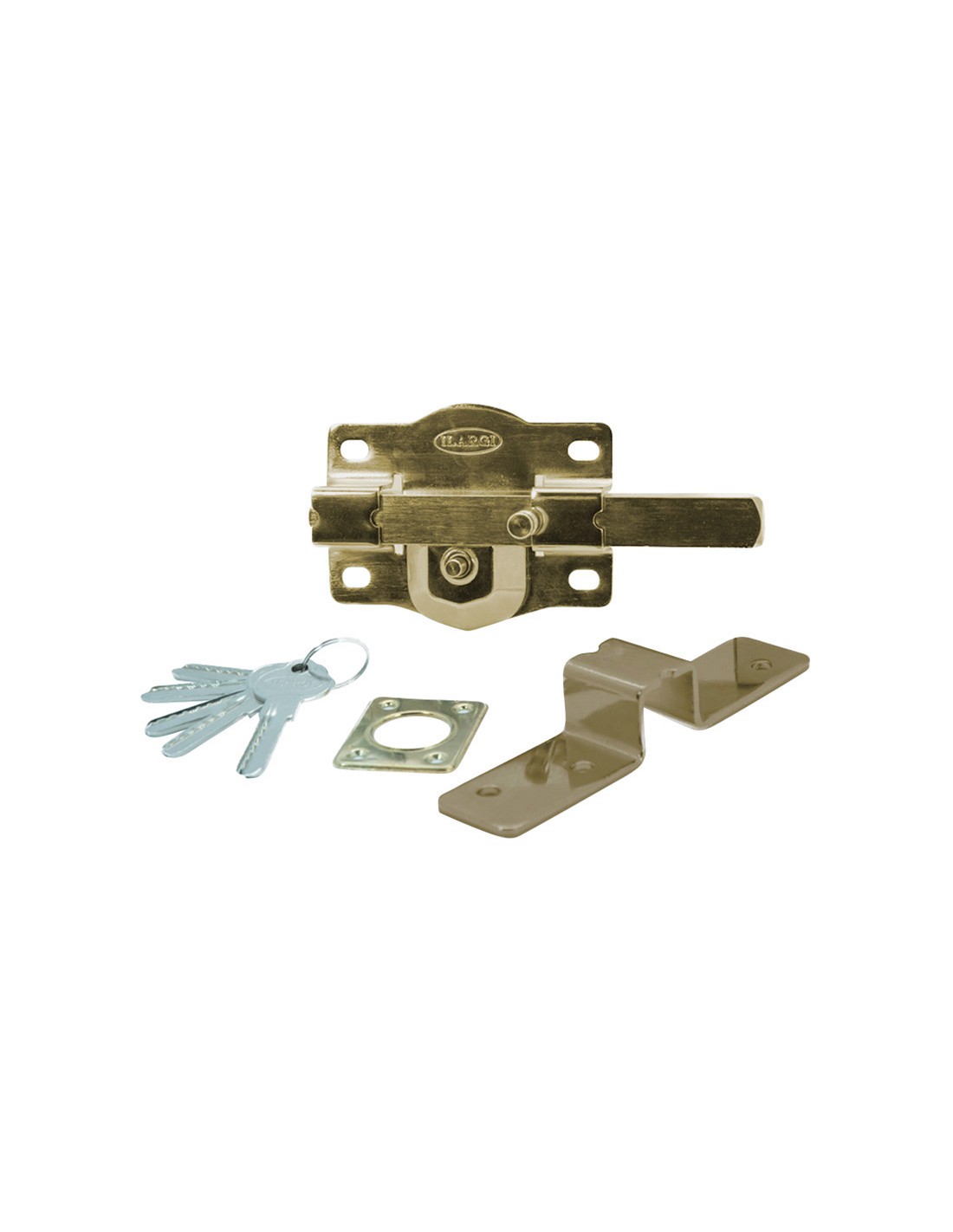 Cerrojo ILARGI 1202S Cilindro exterior de seguridad y botón interior. Barra de acero calibrado de 18 mm. Placa en acero 2 mm. Cerradero en acero de 3 mm. Caja de 105 mm. Acabado en hierro esmaltado de alta resistencia. Incluye 5 llaves. Latonado.