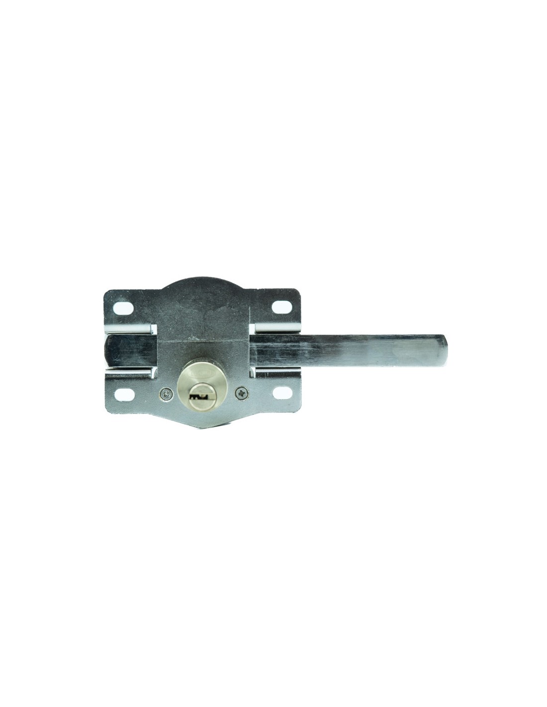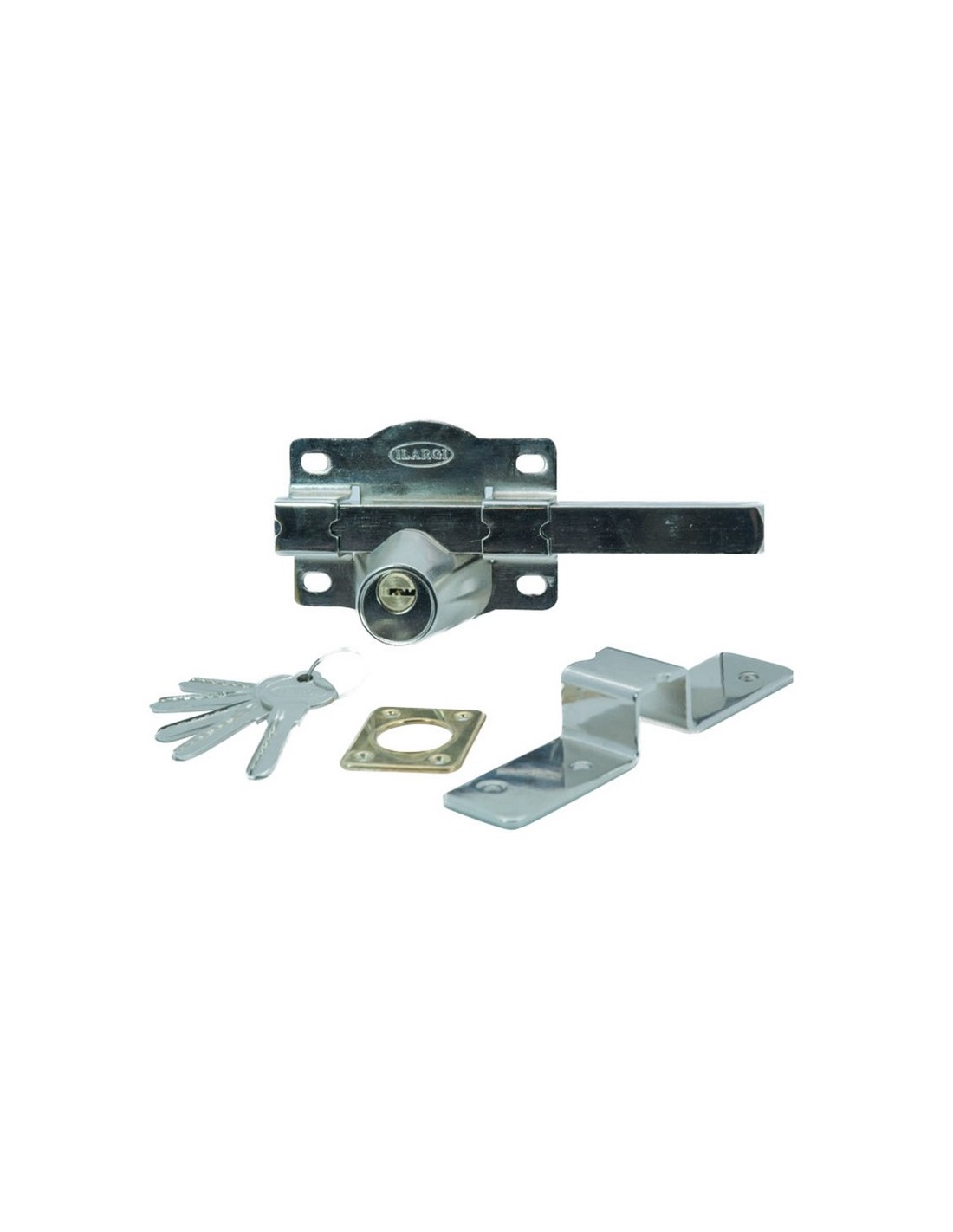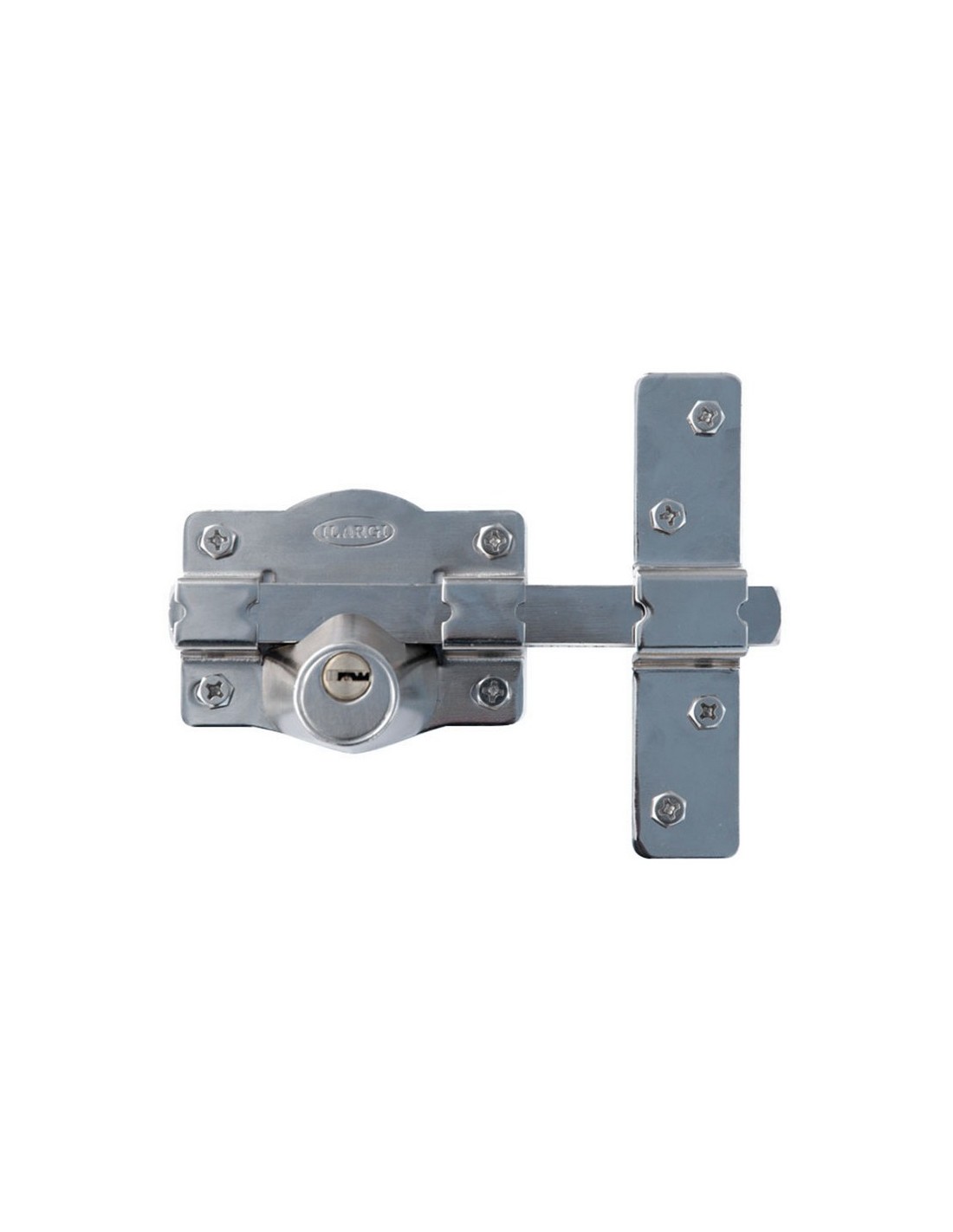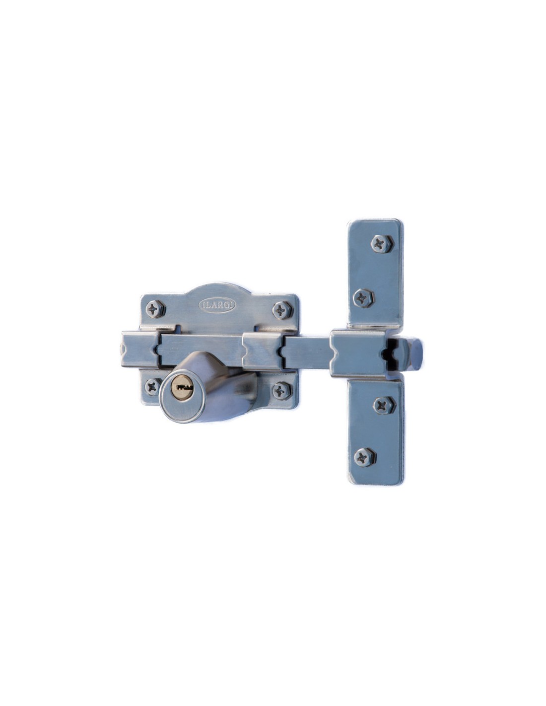 Cerrojo ILARGI 1203S Cilindro interior y exterior de seguridad. Barra de acero calibrado de 18 mm. Placa en acero 2 mm. Cerradero en acero de 3 mm. Caja de 105 mm. Acabado en hierro esmaltado de alta resistencia. Incluye 5 llaves. Niquelado.