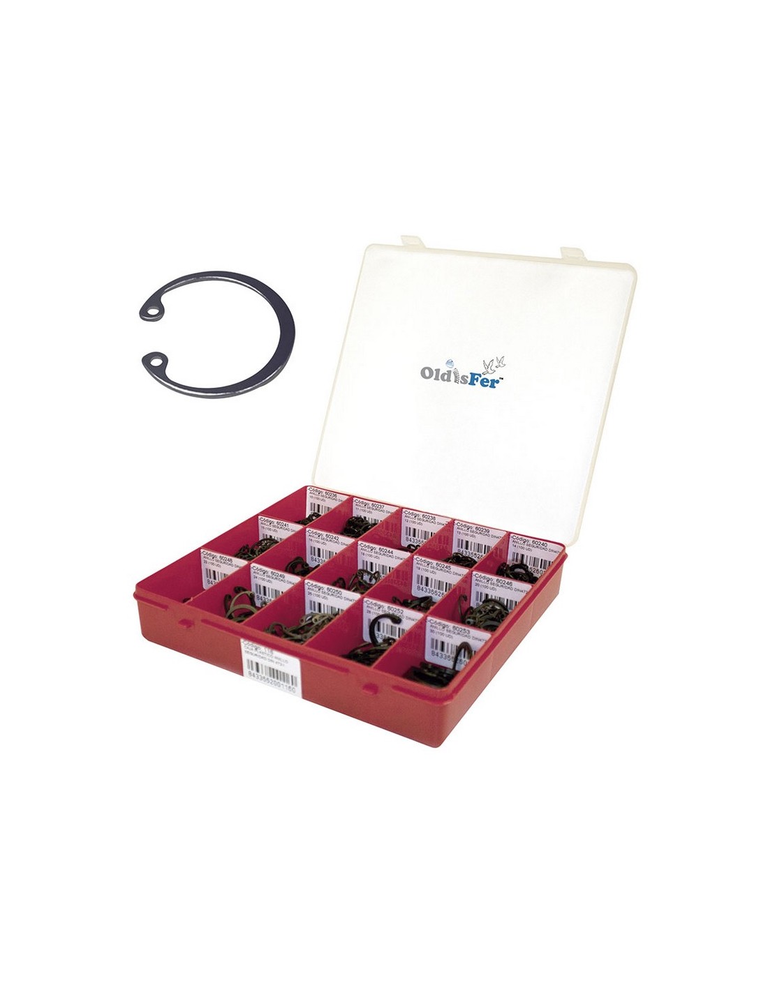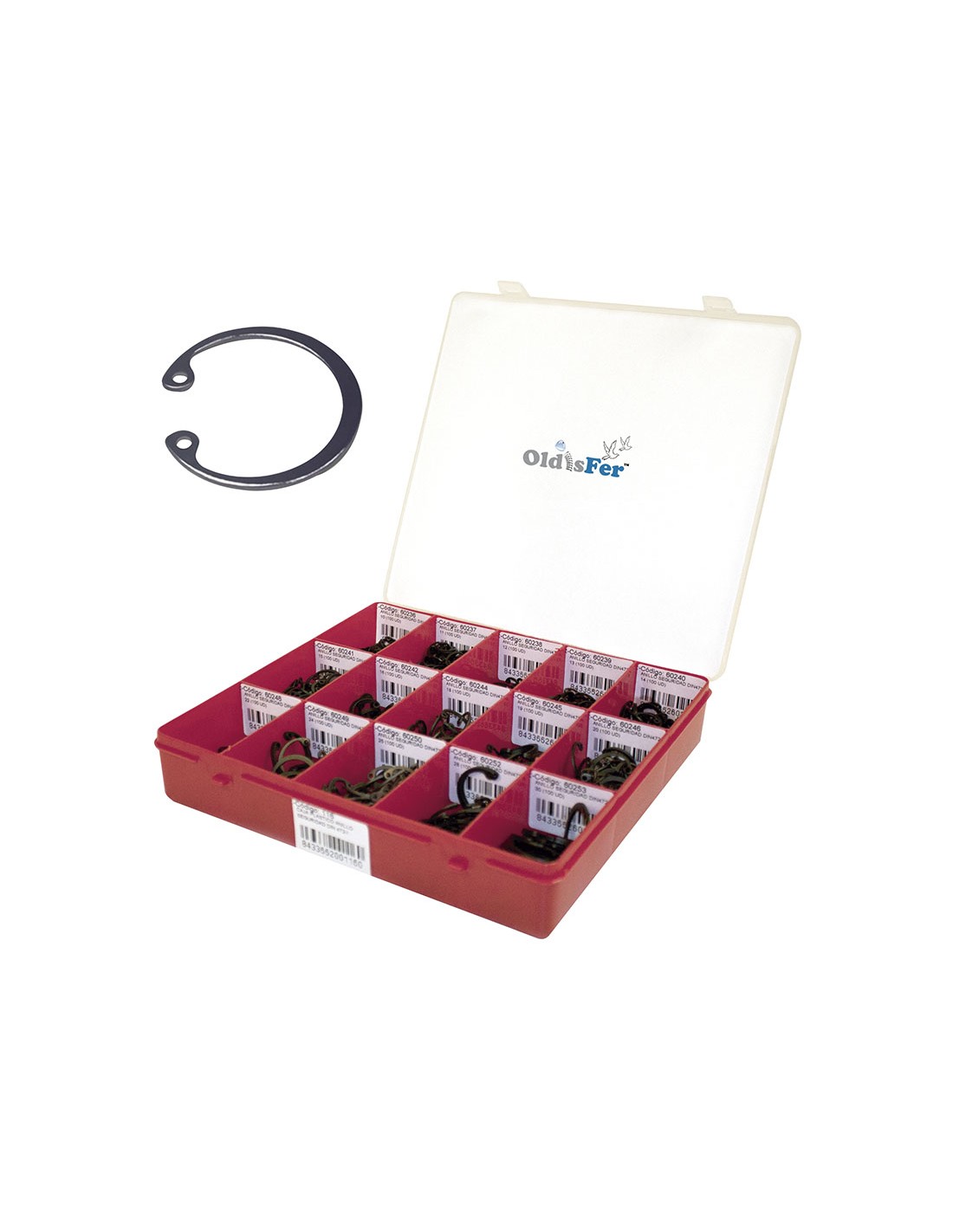 Anillo de seguridad para manillas OLDISFER. Estuche 15 tipos de anillos. Fleje de acero pavonado y aceitado antioxidante. DIN 17.222. Abierto. 1.125 unid.