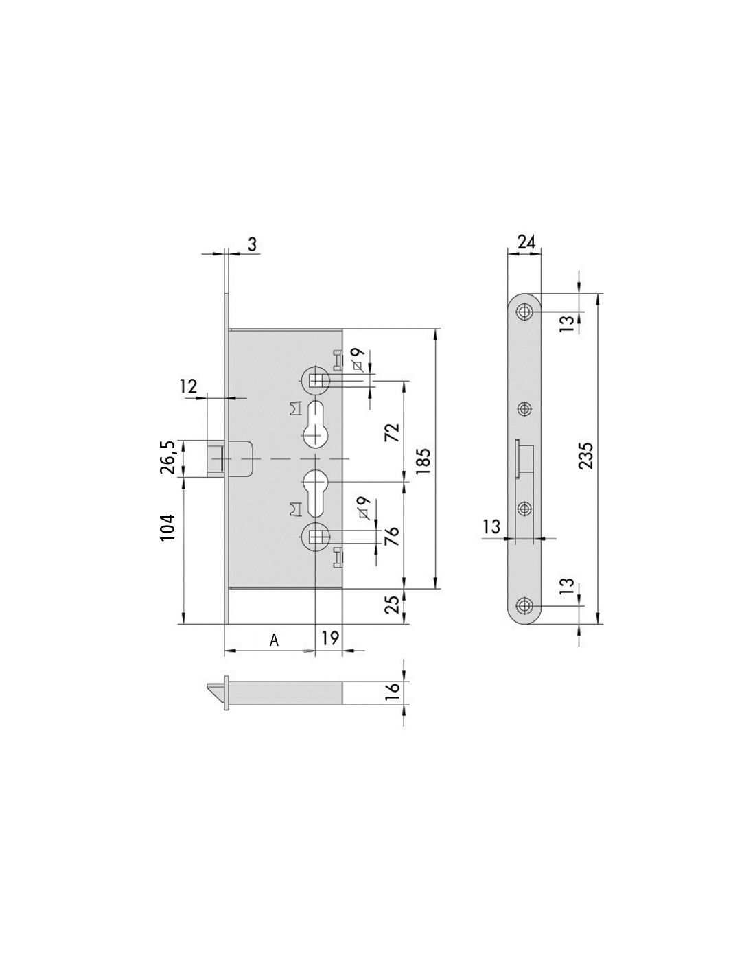 Cerradura cortafuego CISA 43000 Picaporte reversible accionado por llave y manilla. Cuadro manilla 9 mm. Frente, caja y picaporte de acero cincado. Cilindro no incluido. Cincada. Entrada 65 mm.