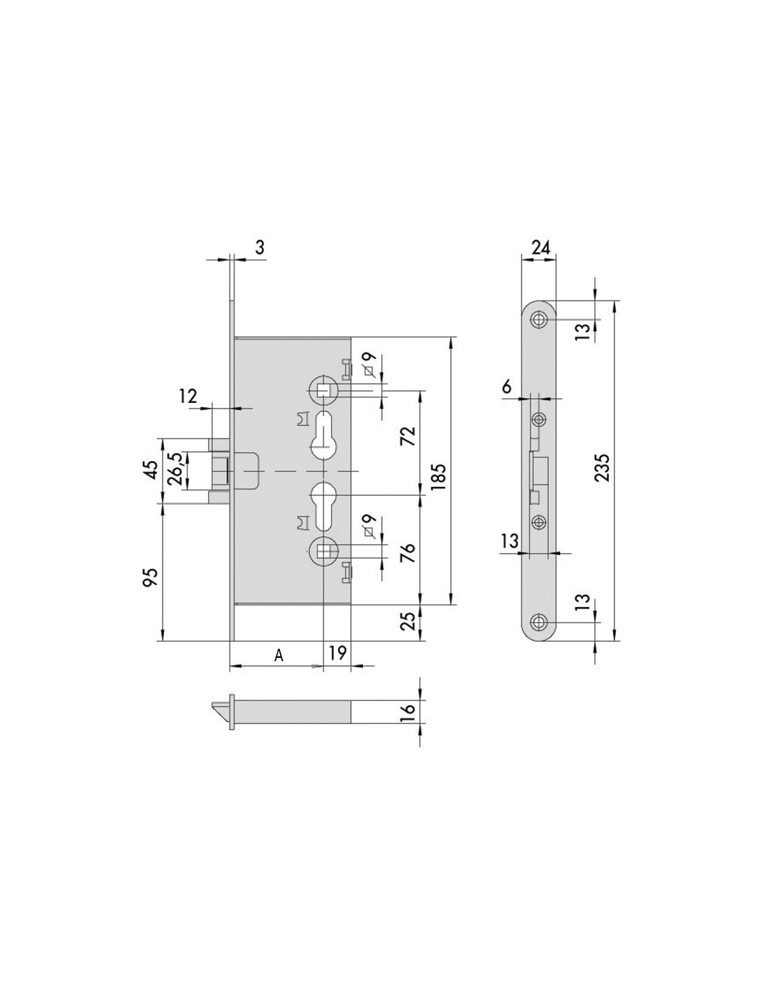 Cerradura cortafuego CISA 43020 Picaporte reversible accionado por llave y manilla. Palanca de 15 mm. accionada por llave. Cuadro manilla 9 mm. Frente, caja y picaporte de acero cincado. Cilindro no incluido. Cincada. Entrada 65 mm.