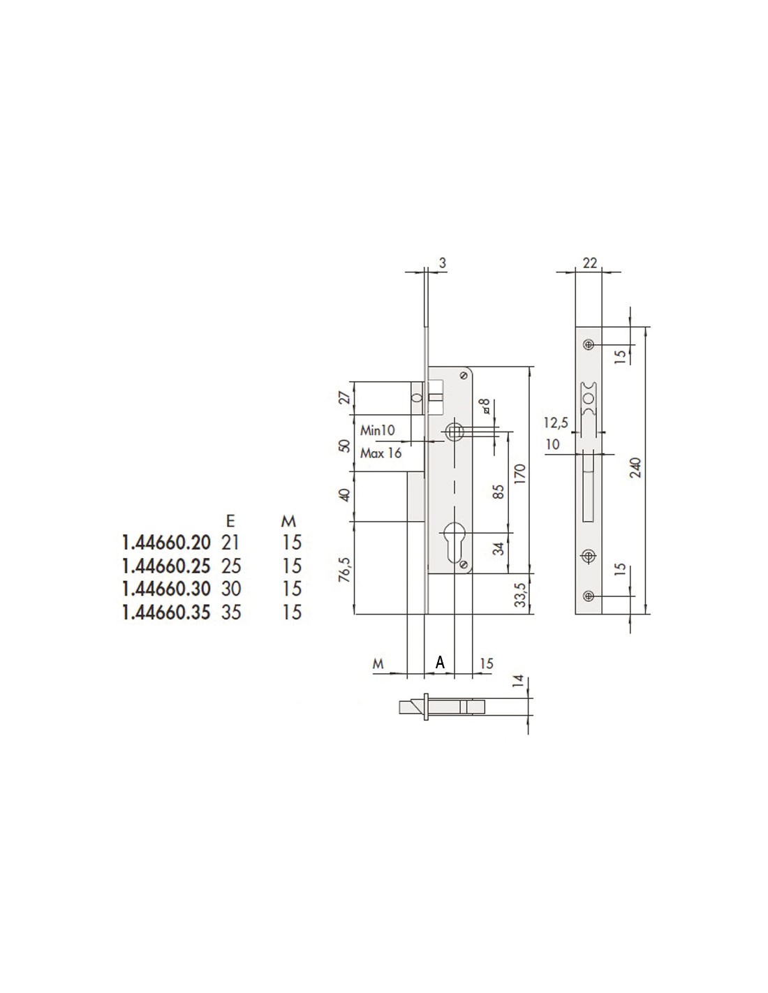 Cerradura embutir carpintería metálica CISA 44660 Golpe y llave. Picaporte regulable y reversible. Rodillo y palanca niquelados. Frente 22x3 cm en acero cincado. Cilindro no incluido. Cincada. Entrada 30 mm.