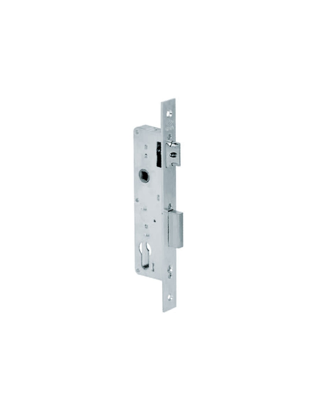 Cerradura embutir carpintería metálica CISA 44660 Golpe y llave. Picaporte regulable y reversible. Rodillo y palanca niquelados. Frente 22x3 cm en acero cincado. Cilindro no incluido. Cincada. Entrada 35 mm.