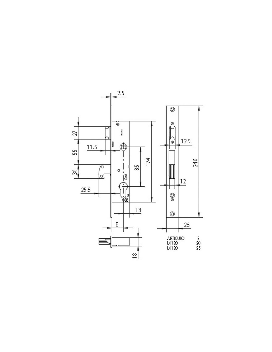 Cerradura embutir carpintería metálica CISA 4140 Golpe y gancho. Picaporte reversible. Acero inoxidable. Entrada 25 mm.