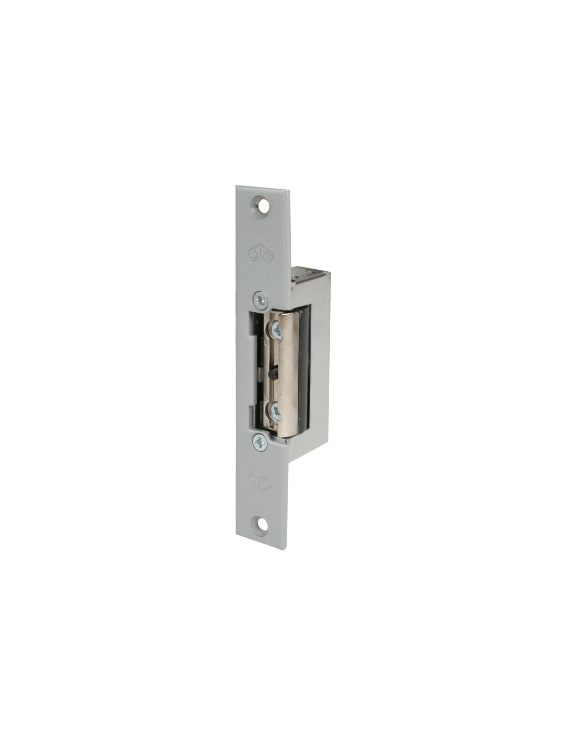 Abrepuertas JIS 1400 RF 12 V. Liberación automática. Pestillo ajustable. Reversible y simétrico. Especial para perfiles estrechos. Medidas: 16,5x28,5xh.67 mm. Frontal corto 909G. Desbloqueo.