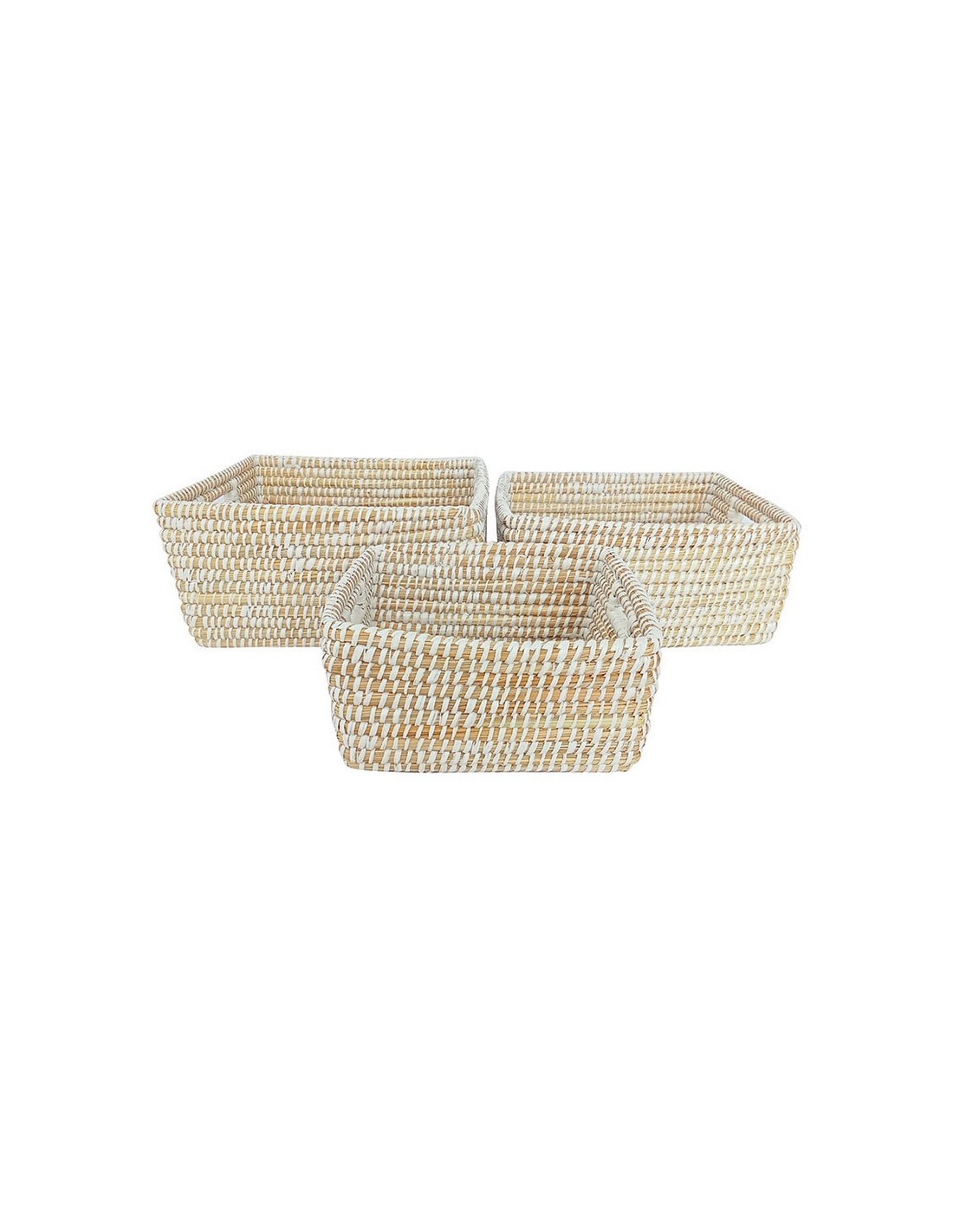 Cesta fibra natural Macao Juego 3 unidades rectangulares. Mimbre Seagrass con ribete plástico color blanco. Medidas:
