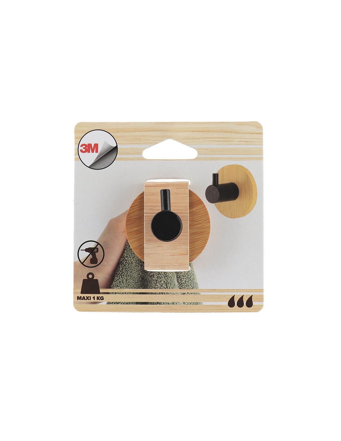 Accesorios baño TENDANCE serie Bambú Sistema fijación adhesiva 3M apta para superficies lisas no porosas, no hace falta taladrar pared. Bambú/metal negro y soportes imitación acero Sencillo ø 4,3x3,5 cm.