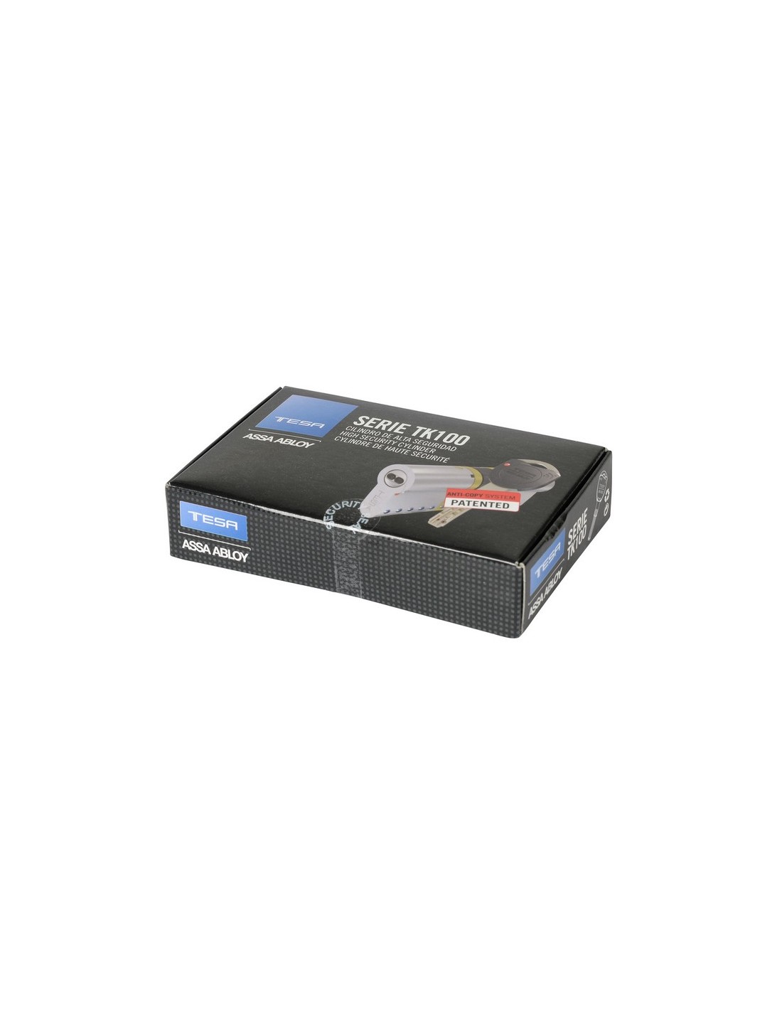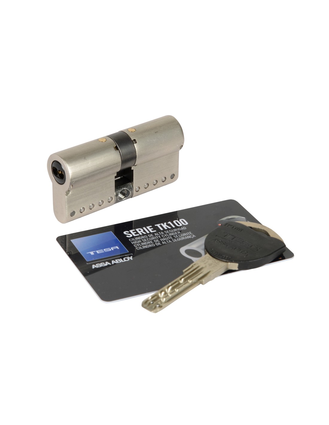 Cilindro alta seguridad TESA TK100 Europerfil. 5 llaves de puntos incopiables. 10 pitones + 2 sensores de seguridad en la llave. Antibumping avanzado. Rotor antiextracción. Protección superior antitaladro y ganzuado. Doble embrague. Excéntrica 15 mm. Niquelado. 60 mm. 30-30.