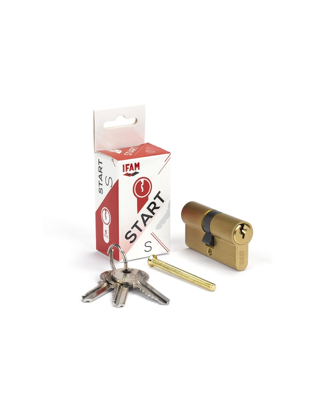 Cilindro estándar IFAM START-S Cilindro con perfil europeo. Fila de 6 pitones de acero. Sistema antiganzúa. Sistema de pitones antitaladro. Con 3 llaves de acero niqueladas. Llaves iguales. KA01 diferente codigo de llave que KA02. Niquelado. 70 mm. 30-40. Llaves iguales KA02.