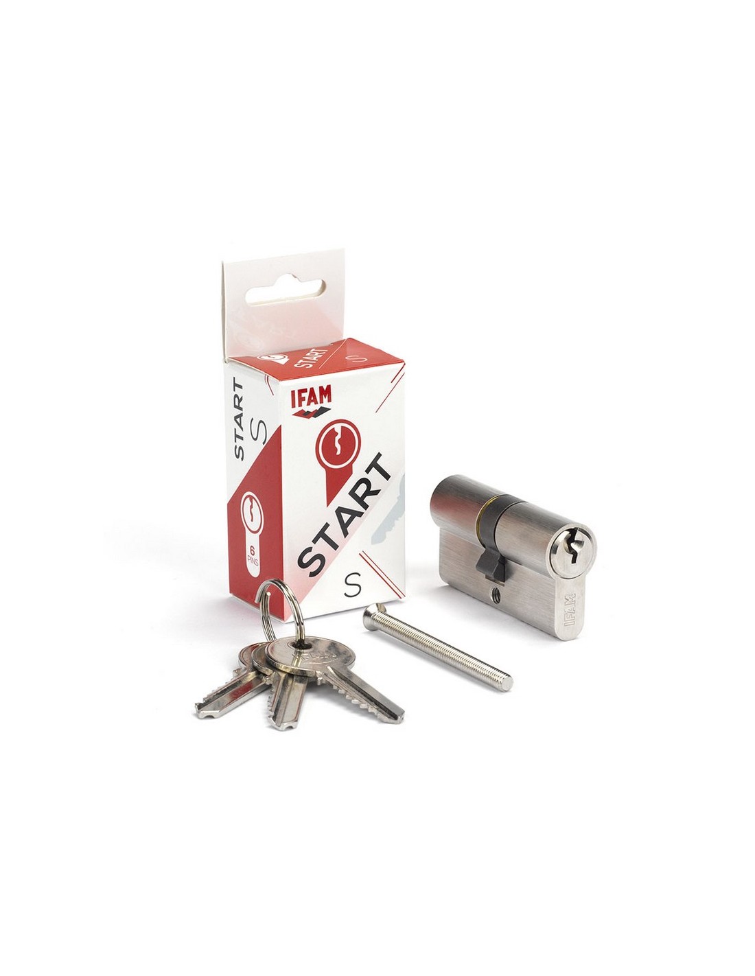 Cilindro estándar IFAM START-S Cilindro con perfil europeo. Fila de 6 pitones de acero. Sistema antiganzúa. Sistema de pitones antitaladro. Con 3 llaves de acero niqueladas. Llaves iguales. KA01 diferente codigo de llave que KA02. Niquelado. 70 mm. 30-40.