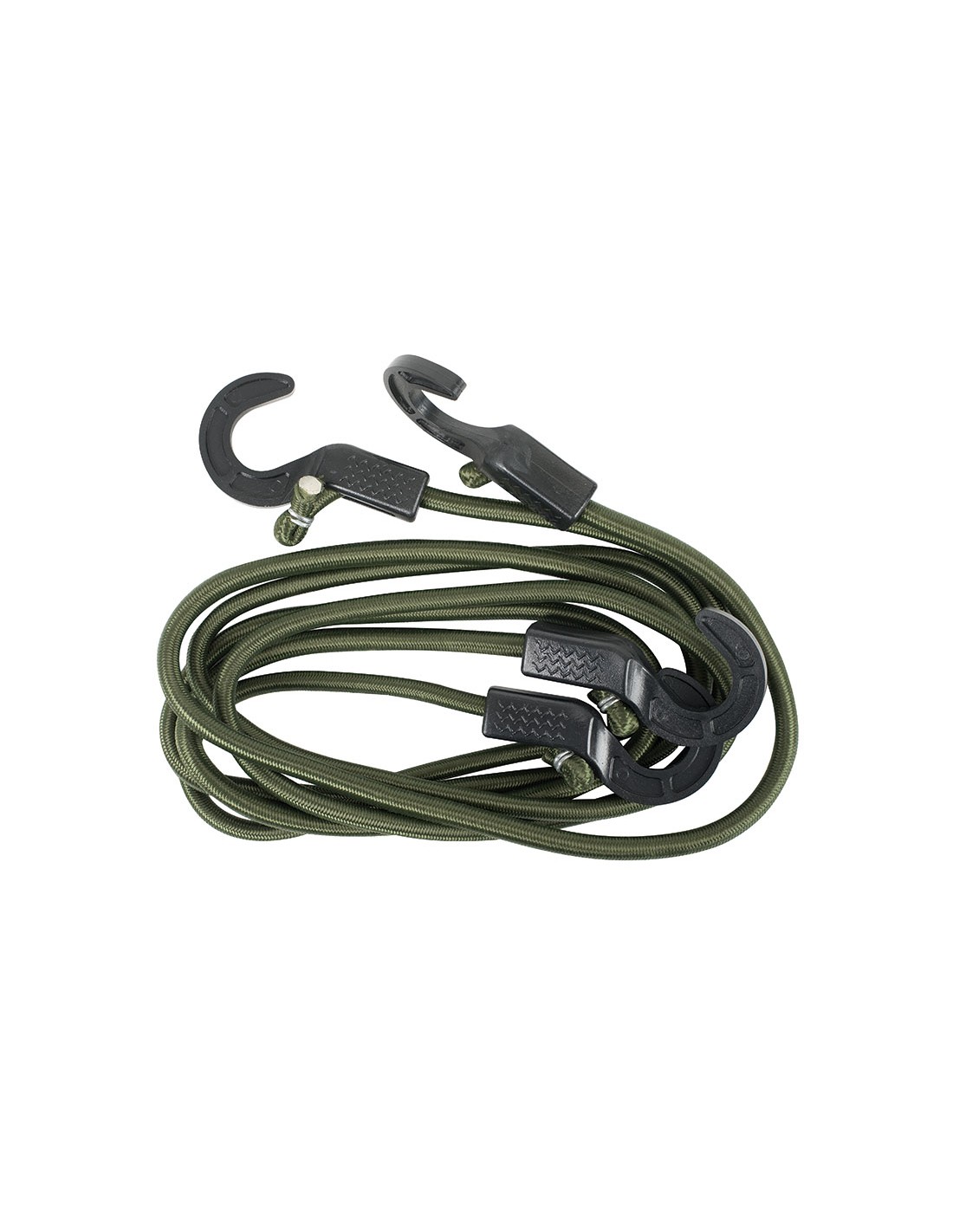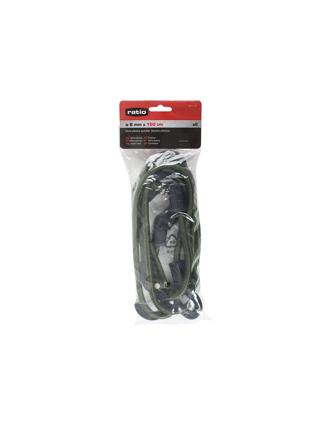 Goma elástica redonda RATIO. Ajustable según necesidad. Ganchos plásticos. Para sujetar mercancía en bicicletas, motos, vehículos (interior), acampadas, etc. Carga máxima de trabajo 7 kg. ø 8 mm x 150 cm. 2 unid.