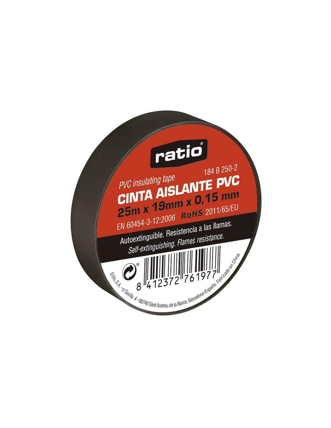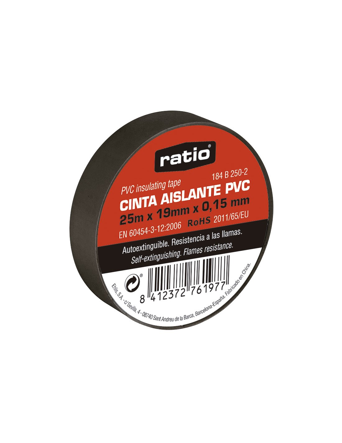 Cinta aislante RATIO. PVC. Espesor 0,15 mm. Autoextinguible. Resistencia a las llamas. Normativa EN 60454-3-12:2006. Directiva RoHs 20011/65EU. 25 m x 19 mm. Negro.