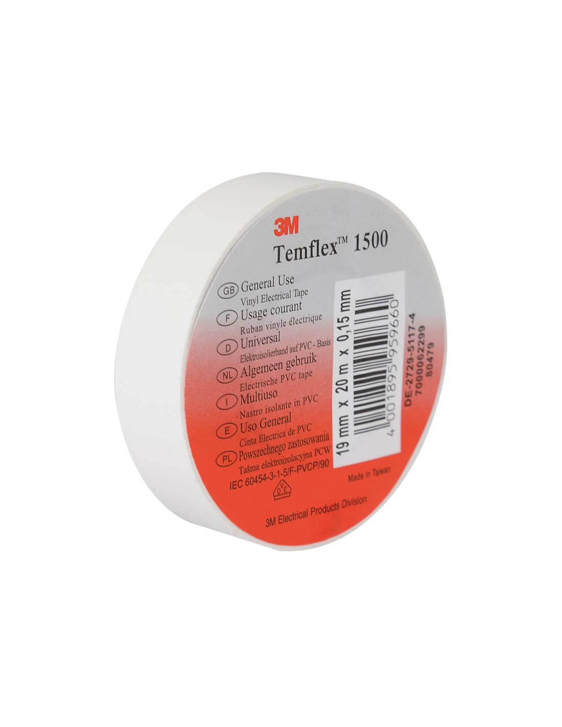 Cinta aislante 3M Temflex. Vinilo. Espesor 0,15 mm. Adhesivo de caucho sensible a la presión. 20 m x 19 mm. Blanca.