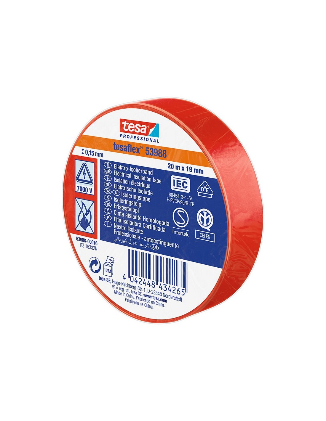 Cinta aislante TESA Tesaflex PVC blando. Soporte grueso, alta flexibilidad y rendimiento bueno en acero y a bajas temperaturas. Certificaciones VOC, REACH, y RoHS. Certificado según norma IEC 60454-3-1, VDE, IMQ, SEMKO. Tensión de ruptura dieléctrica Voltaje de 7.000 Volt. Resis 20 m x 19 mm. Roja.