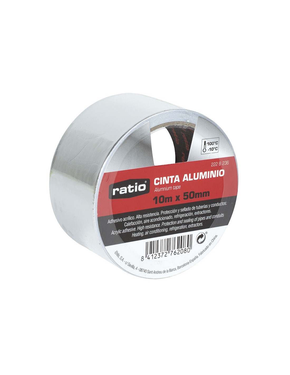 Cinta de aluminio RATIO. Adhesivo acrílico con papel siliconado protector de alta resistencia. 30 micras. Especial para la protección y sellado de tuberías y conductos: calefacción, aire acondicionado, refrigeración, extractores. Temperaturas de -10 a 100º C. 10 m x 50 mm.